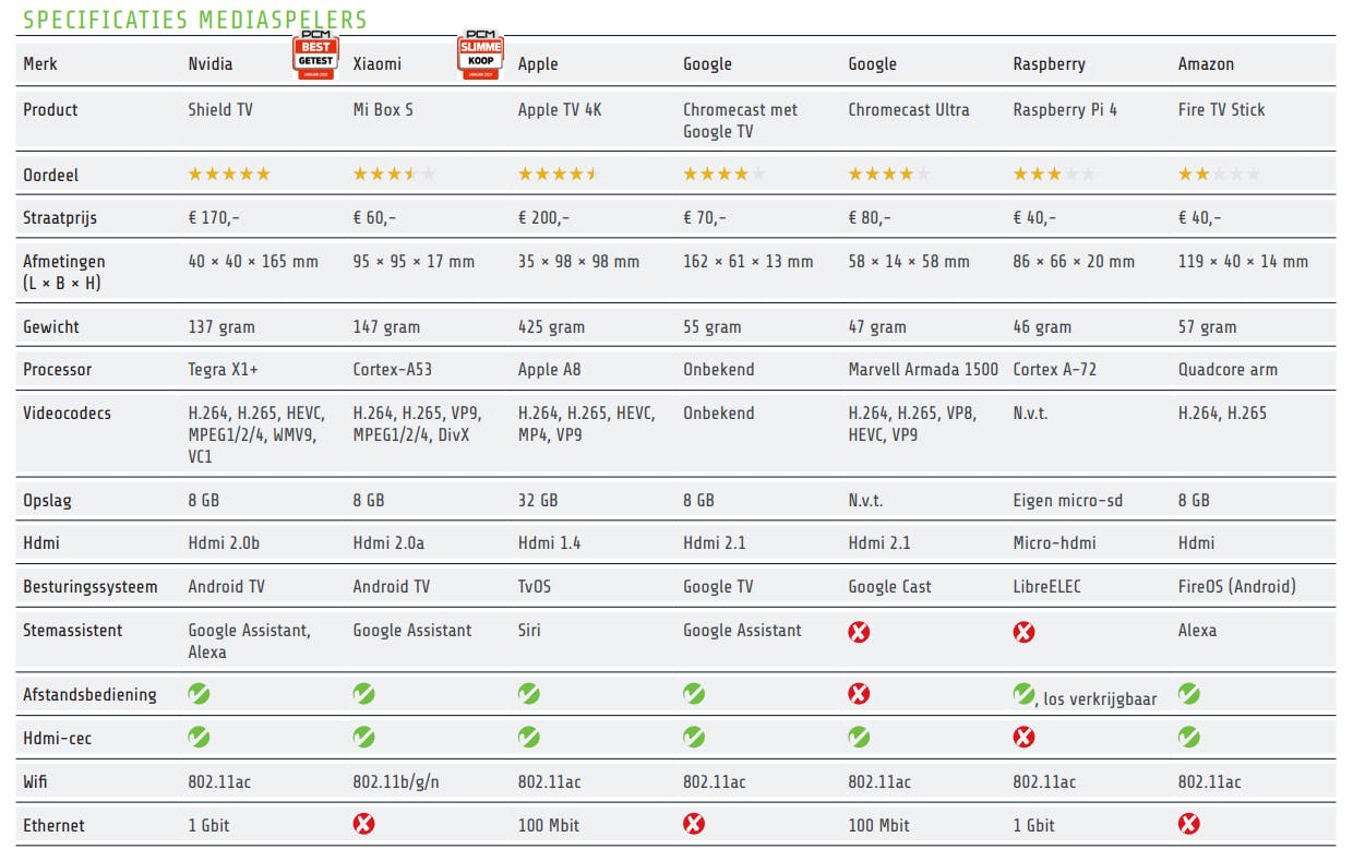 Het is lastig om de mist in te gaan bij de aanschaf van één van deze mediaspelers. Van al onze geteste apparaten had alleen de Fire TV wat stotters bij het gebruik. Op bijna ieder apparaat zijn alle grote streamingdiensten wel te gebruiken, waardoor het verschil vooral in details zoals de codecs zit. Niet ieder apparaat draait even vloeiend video’s in 4K, waar de Nvidia Shield en Apple TV 4K de beste keuzes voor lijken te zijn. De Shield krijgt dan ook het keurmerk Best getest en de Xiaomi Mi Box S is de Slimme koop vanwege de uitstekende prijs-kwaliteitverhouding.