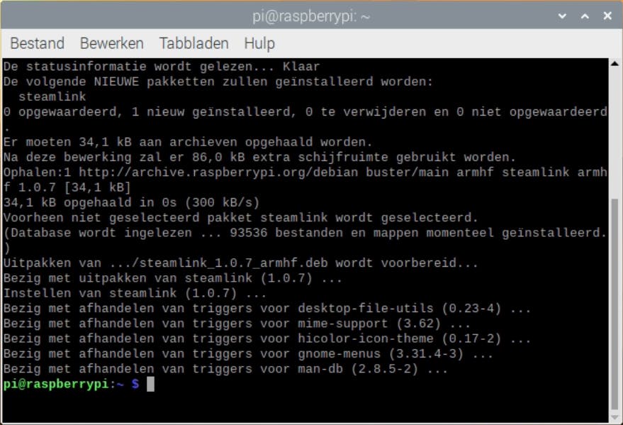 Nu de terminal openstaat installeer je ook direct Steam Link. Daarvoor dien je eerst de pakketlijsten bij te werken. Geef hiervoor de opdracht sudo apt update. Als alle pakketlijsten zijn bijgewerkt, installeer je Steam Link met de opdracht sudo apt install steamlink. Na de installatie start je Steam Link met de opdracht steamlink. Er wordt dan automatisch een snelkoppeling op het bureaublad aangemaakt. Ook kun je Steam Link openen via het applicatiemenu, onder Spelletjes.