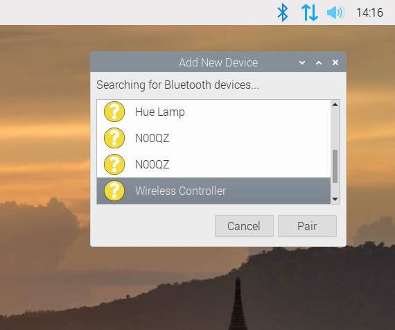 Klik daarna rechtsboven op het bluetoothpictogram en kies Add Device. Druk tegelijkertijd op de Share- en PlayStation-knop op je controller om de controller in koppelmodus te zetten. Kies Wireless Controller en druk op de knop Pair.