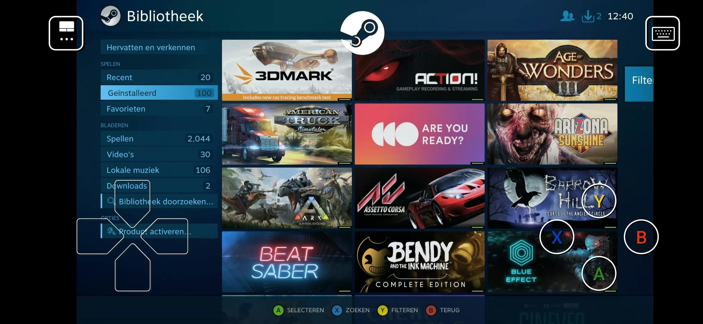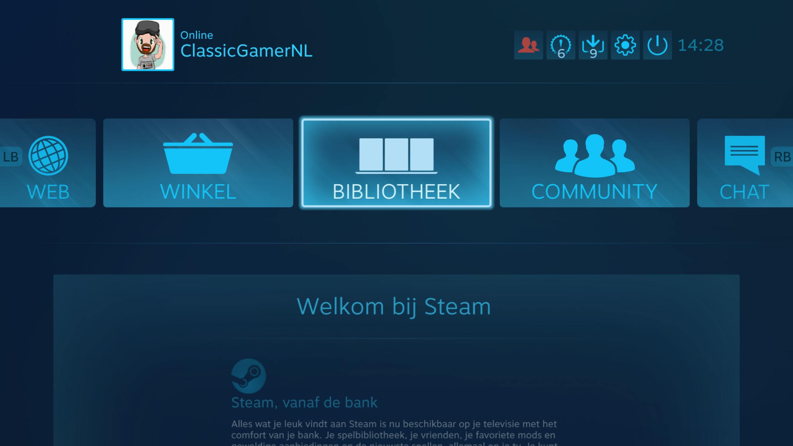 Steam wordt geladen in de zogenoemde big picture mode. Deze grafische interface is speciaal ontworpen om Steam te bedienen met een controller op de televisie. Naast het opstarten van de games uit je bibliotheek kun je ook via big Picture mode websites bezoeken, de community bekijken en chatten met vrienden. Het belangrijkste onderdeel is natuurlijk de bibliotheek. Spellen zijn vanaf hier gemakkelijk op te starten. Als er spellen ontbreken, kan dat komen omdat de dienst automatisch de bibliotheek filtert op de spellen die geoptimaliseerd zijn voor remote play. Rechts in het venter kun je dit filter uitschakelen om alle games zichtbaar te maken.