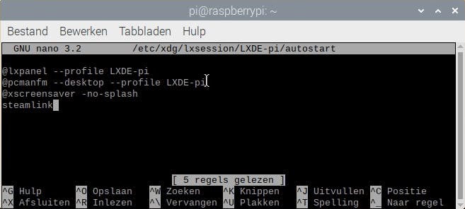 Ga met de pijltjestoetsen helemaal naar beneden en voeg op een nieuwe regel het volgende woord toe: steamlink. Druk op de toetsencombinatie Ctrl+X om en kies Ja om wijziging op te slaan en nano te sluiten. De volgende keer dat de Raspberry Pi opstart, zal Steam Link automatisch worden geladen.