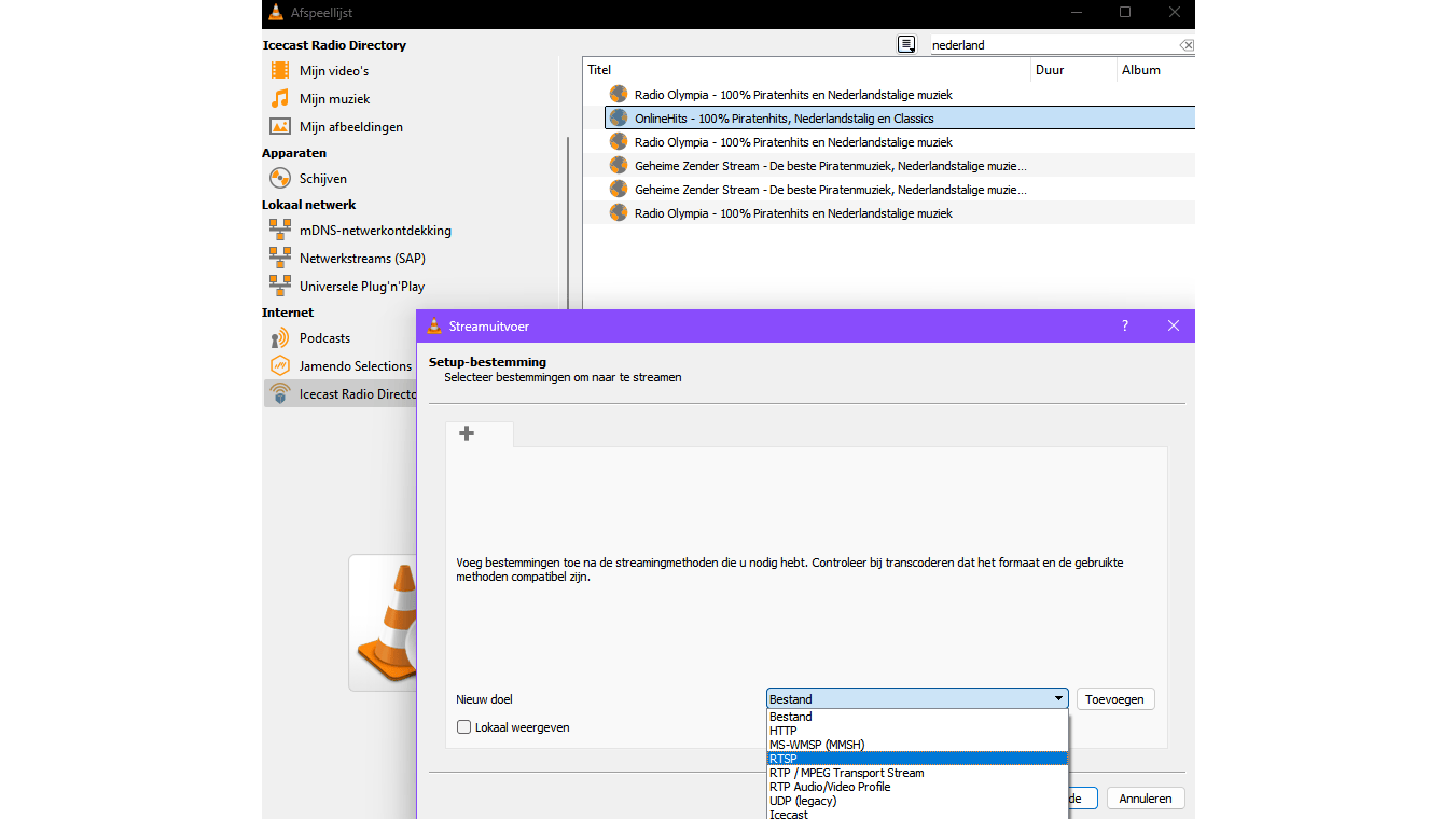 In het venster scrol je naar de rubriek Internet en selecteer je Icecast Radio Directory. Even later verschijnt een lijst met honderden radiostations. Tik bijvoorbeeld Nederland in en je krijgt een handvol zenders met piratenhits. Klik met rechts op een station om de stream direct in VLC af te spelen of naar een ander apparaat of netwerk te streamen, met instelbare parameters als formaat, bestemming en protocol. Dit is handig om bijvoorbeeld media binnen een netwerk te delen.