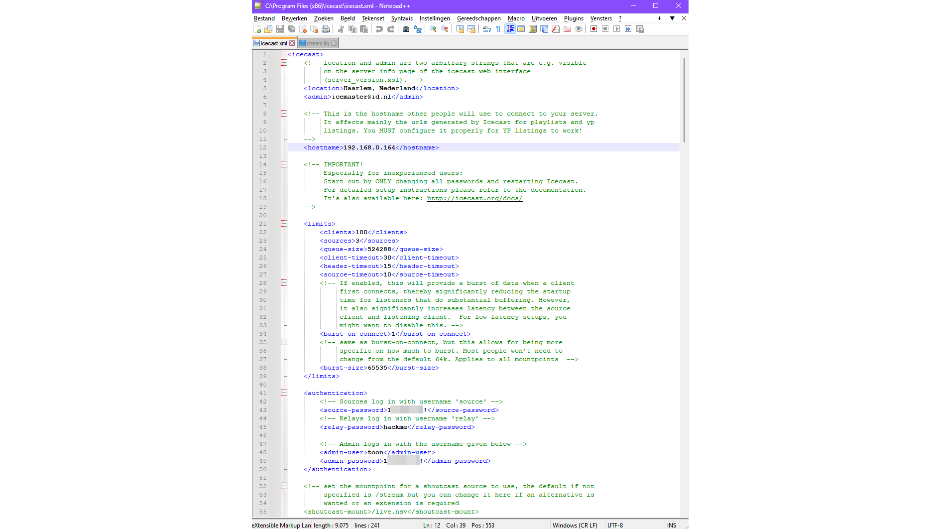 In de installatiemap (standaard C:\Program Files (x86)\Icecast) vind je naast enkele submappen de bestanden icecast.xml en icecast.bat. Het eerste is het configuratiebestand, dat je opent in een editor die XML ondersteunt, zoals het gratis Notepad++. Het tweede is een batchbestand waarmee je de Icecast-server start, standaard met de instellingen zoals vastgelegd in icecast.xml.