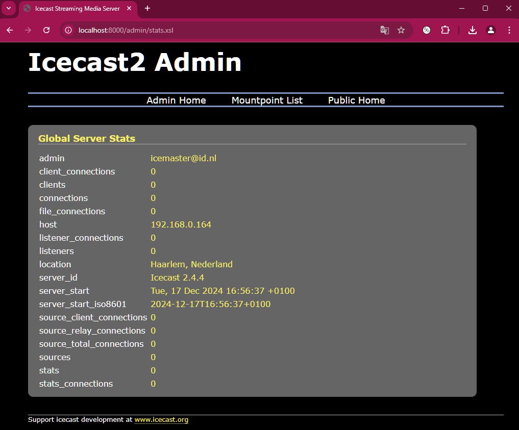 Sla het aangepaste xml-bestand op en start de server door te dubbelklikken op het standaard geïnstalleerde bestand icecast.bat. Je kunt de server nu bereiken via http://localhost:8000 (of een ander ip-adres). Klik op Admin Home en vul je inloggegevens in om de serverstatistieken te bekijken.