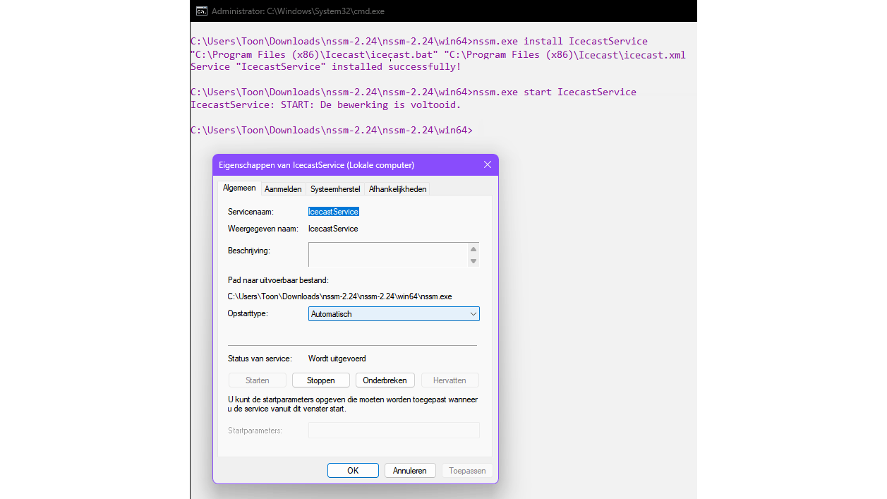 Je kunt het bestand icecast.bat toevoegen aan Windows Taakplanner om het automatisch te starten. Een andere optie is een tool als NSSM (the Non-Sucking Service Manager) om Icecast als een Windows-service te draaien, zodat je niet langer aangemeld hoeft te zijn voor de Icecast-server. Start hiervoor de Opdrachtprompt als administrator, ga naar de uitgepakte NSSM-map en voer het volgende commando uit: