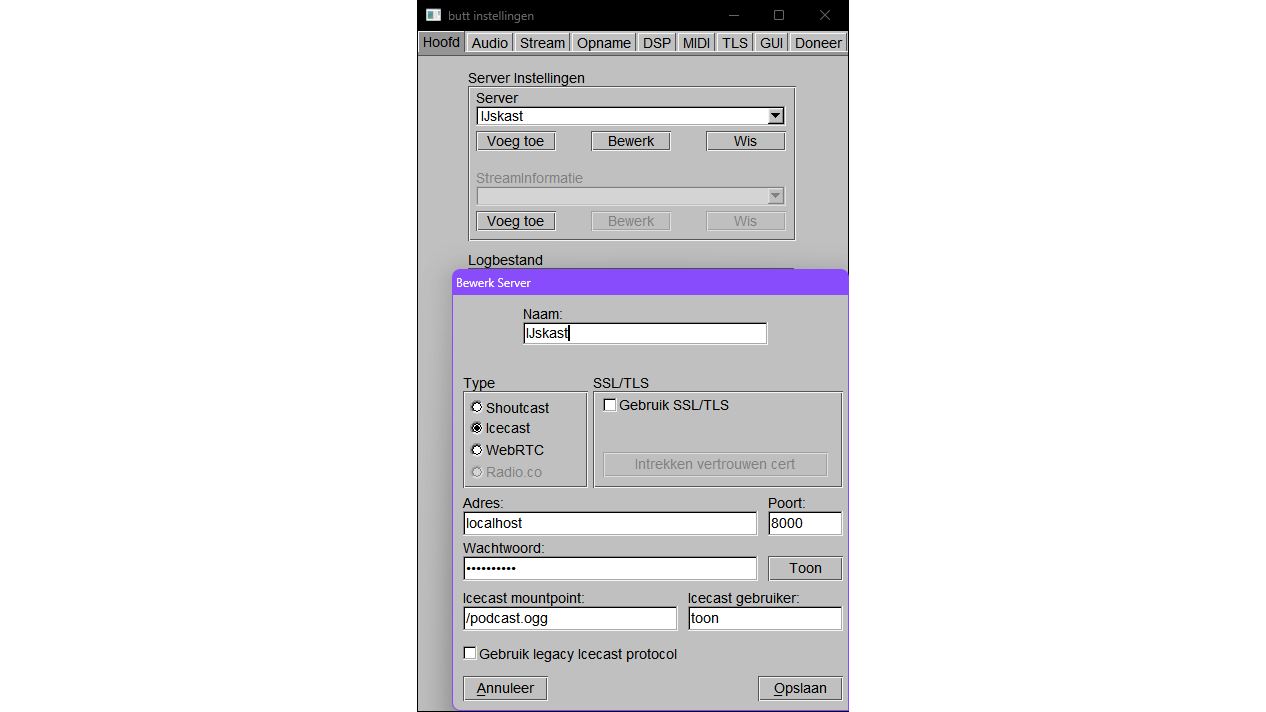 Je moet in de client-app Butt ook eerst de Icecast-server instellen.