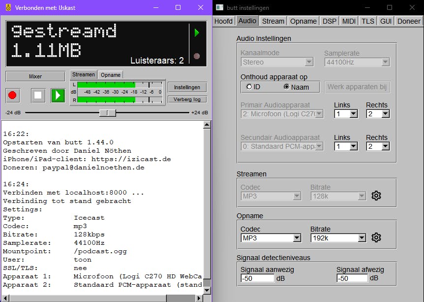 Butt is de audio van de ingestelde audioapparaten aan het streamen.