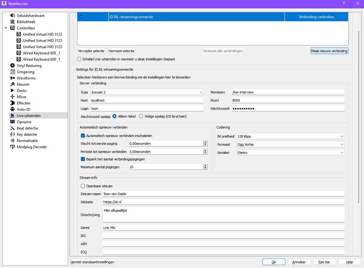 Net als in Butt moet je ook in Mixxx de Icecast-server definiëren.