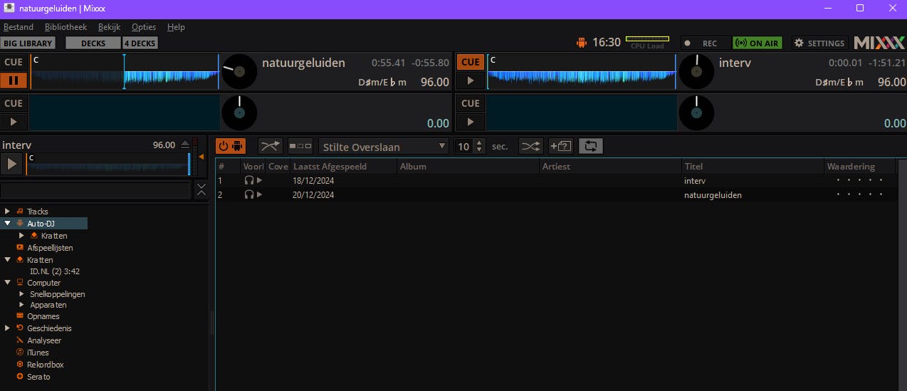 Om meerdere nummers achter elkaar te streamen, gebruik je de Auto-DJ-functie. Klik linksboven op Big Library om de audiobibliotheek te openen. Hier vind je lijsten als Tracks, Afspeellijsten, Kratten (virtuele trackverzamelingen) en Auto-DJ. Sleep de gewenste audiobestanden vanuit Verkenner naar het Auto-DJ-venster. Net boven de lijst kun je opties activeren, zoals loop, shuffle of het toevoegen van een willekeurige track uit je kratten. Schakel de Auto-DJ-functie in met het aan-uitknopje bovenaan de lijst. Controleer of On Air actief is, zodat de nummers netjes naar de Icecast-server worden gestreamd.