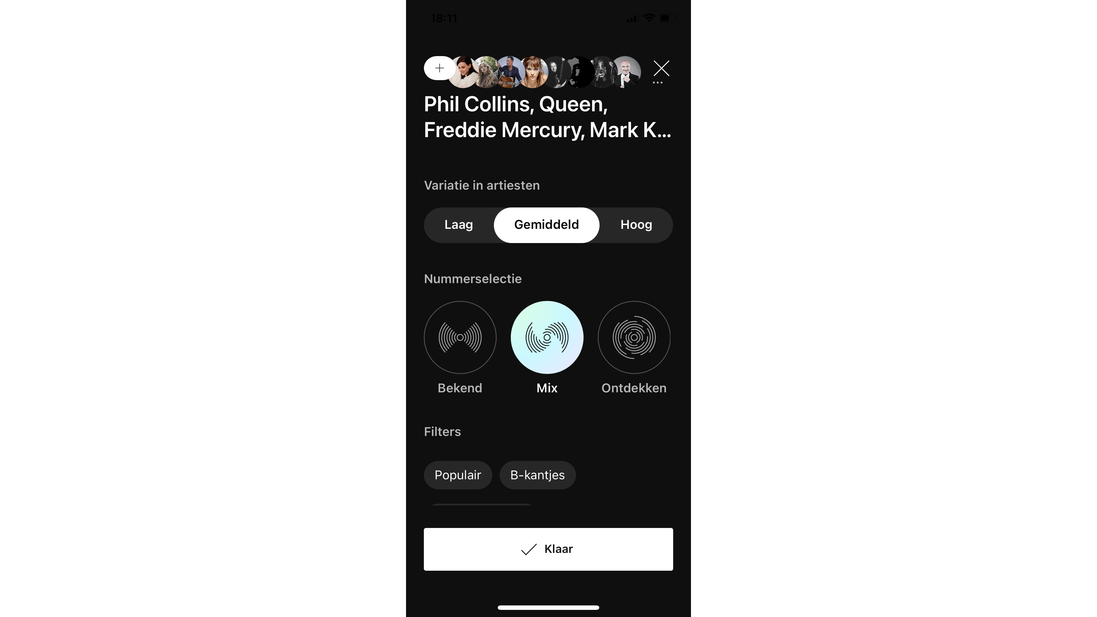 In het tweede scherm bepaal je hoeveel variatie je wilt horen op de zender. Je hebt de keuze tussen drie variatiegraden: Laag, Gemiddeld en Hoog. Als je bijvoorbeeld Hoog kiest, dan zul je een brede reeks vergelijkbare artiesten horen. Daaronder beslis je of je alleen de bekende nummers wilt horen, of een mix van bekende en minder bekende nummers. De derde optie is dat je op ontdekking wilt gaan in de volledige oeuvres van deze artiesten. Daaronder is het mogelijk om filters toe te passen. Op dit moment is het aanbod filters nogal bescheiden: populair, B-kantjes, nieuwe releases, opzwepend, chill, vrolijk, stemmig en concentratie. Als je al die keuzes hebt gemaakt, dan klik je op de knop Klaar.