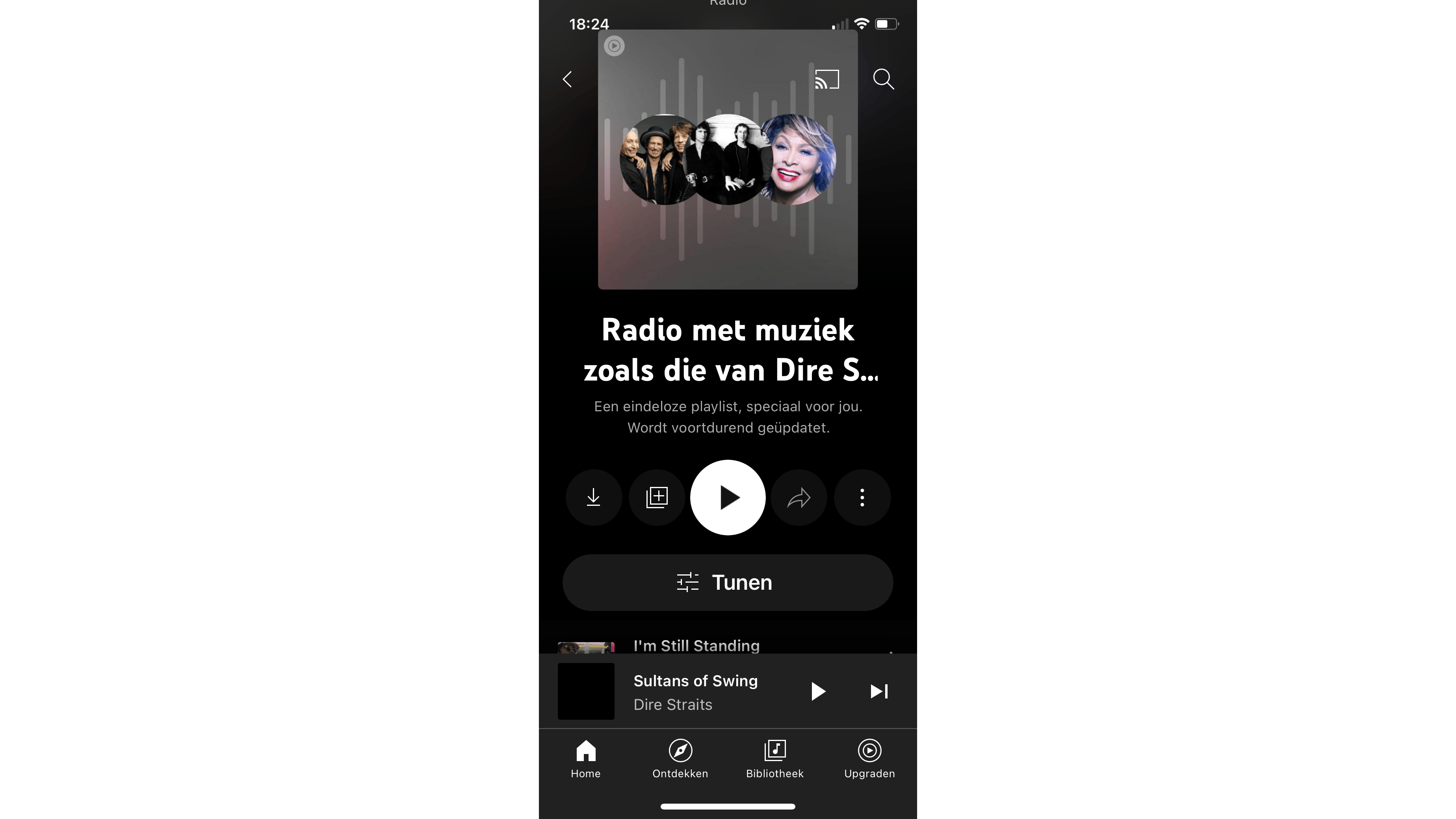 Daarna is je radiostation klaar in de vorm van een eindeloze playlist op basis van de voorkeuren die je hebt ingesteld. Er verschijnt een radiostation met de naam Radio met de muziek zoals die van (naam van de eerste artiest). Je kunt je radiostation toevoegen aan de bibliotheek en het is mogelijk de playlist te downloaden met Music Premium. Het blijft trouwens mogelijk om het radiostation te wijzigen door op de optie Tunen te tikken. Je kunt dan artiesten toevoegen of verwijderen en eventueel ook de andere parameters aanpassen.