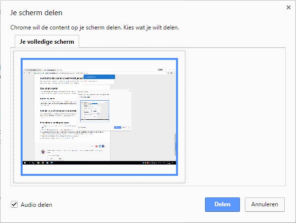 Je geeft eenvoudig het bureaublad van je computer op de televisie weer. Dat is nuttig wanneer je bijvoorbeeld een presentatie moet geven of zelfgemaakte foto’s wilt laten zien. Je hebt hiervoor de browser Chrome nodig. Open rechtsboven het menu en klik op Casten. Achter Casten naar zie je een klein pijltje staan. Zodra je daarop klikt, kies je voor Bureaublad casten. Je klikt daarna op de naam van je Chromecast, waarna je bevestigt met Delen. In het laatste venster besluit je desgewenst om ook het geluid van de pc op je televisie af te spelen. Houd er rekening mee dat je audio alleen vanaf Windows-machines kunt doorgeven. Op een Mac of Chromebook werkt dat namelijk niet.