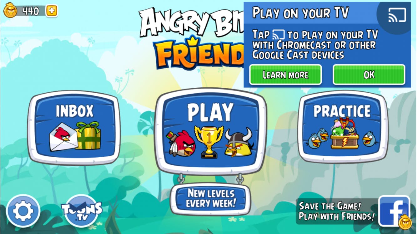 Je Chromecast fungeert prima als veredelde spelconsole voor eenvoudige games. Sinds anderhalf jaar kunnen gameontwikkelaars namelijk een cast-pictogram toevoegen. De beelden verschijnen op televisie en de smartphone dient als controller. Op die manier ben je prima in staat om videospelletjes in groot formaat te spelen. Zowel voor Android als iOS zijn er allerlei leuke titels te vinden. Probeer bijvoorbeeld het vermakelijke videospelletje Angry Birds Friends maar eens uit. Zodra je deze game voor de eerste keer opent, detecteert de app binnen je thuisnetwerk automatisch de Chromecast. Er verschijnt namelijk een melding met de vraag of je Angry Birds Friends op een televisie wilt spelen. Tik op OK en tik vervolgens op de naam van je Chromecast. Druk op je smartphone-scherm op Play en geniet van de game. In dit voorbeeld maak je op de smartphone een veegbeweging om de katapult te lanceren. Het resultaat zie je vervolgens terug op televisie. Tik tweemaal kort achter elkaar om het menu te openen. Je kunt nu de televisieweergave zo nodig afsluiten.