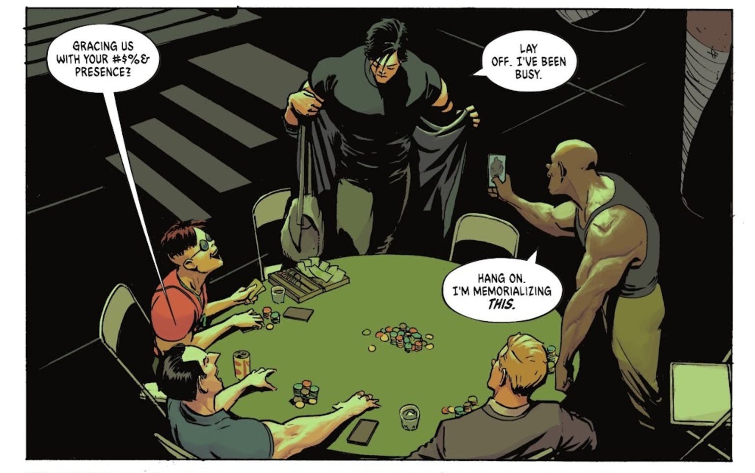 Vergis je niet, dit is nog altijd Batman. Bruce Wayne is slim, getraind in vechten en in principe tegen moord. In principe, want deze versie van Batman is ook boos. Tijdens de eerste confrontatie met zogenaamde Party Animals, bendeleden die burgers bruut vermoorden voor geld via augmented reality-brillen en cryptovaluta, is zijn aanpak weinig subtiel. Sterker nog: zijn tactiek is de frontale aanval, als een eenmansleger de hele bende in één keer schoonvegen. Alfred Pennyworth, in deze realiteit een huurmoordenaar, beschrijft steeds zijn verbazing over de jonge Bruce. Alles aan de 220 kilo wegende kerel is groot, bruut en angstaanjagend. Zijn pak? Vol stekels en verborgen messen. De Batmobiel? Een gigantische truck die Alfreds zorgvuldig opgebouwde geheime identiteit in één bloedstollende rit overboord gooit.