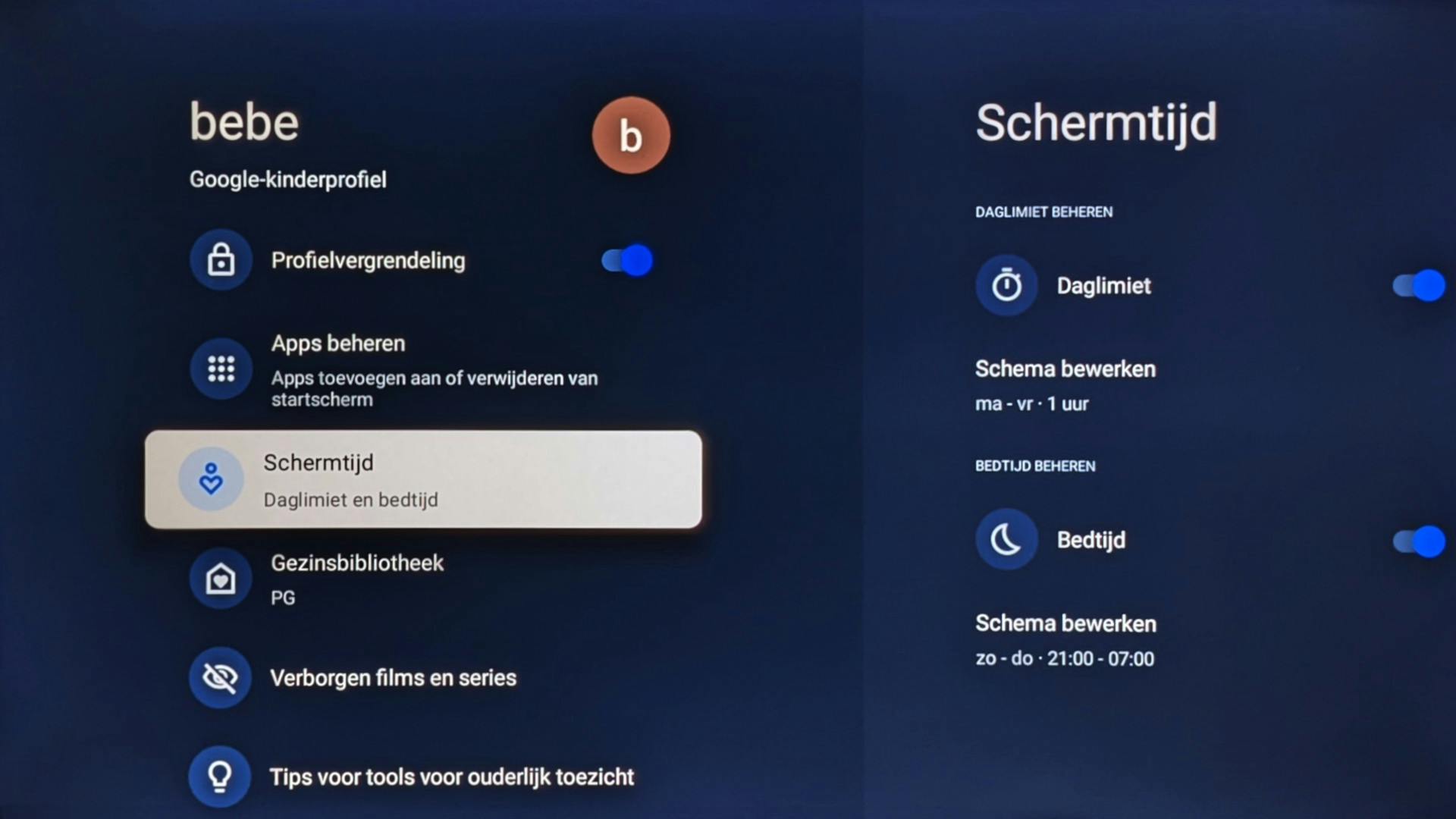 Google TV biedt je ook de mogelijkheid om met meerdere accounts te werken, die dan elk hun eigen aanbevelingen krijgen. Diensten met een log-in zijn gedeeld tussen accounts. Er zijn ook kinderprofielen, waar je als hoofdgebruiker beperkingen op app-niveau of schermtijd kunt instellen.