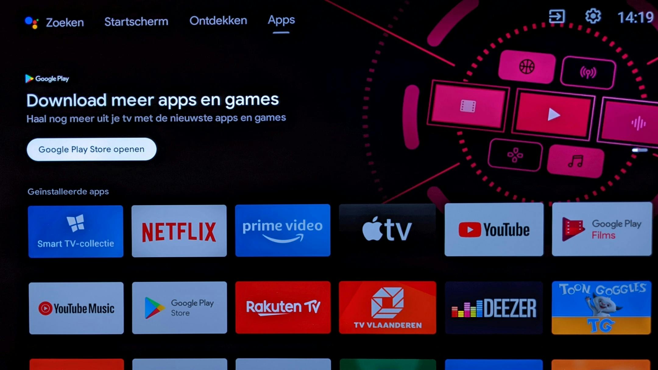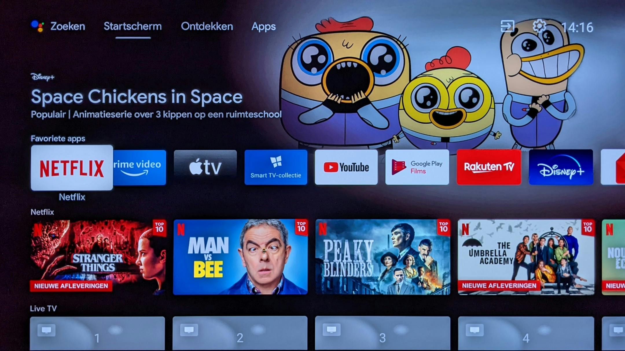 De recentste versie van Android TV (versie 11) heeft steeds meer gelijkenissen met Google TV. Het heeft bovenaan vier verschillende secties. Je start (niet heel verwonderlijk) op het Startscherm. Een klik naar links brengt je in Zoeken, verder staan rechts de secties Ontdekken en Apps. Op de eerste rij vind je nog steeds je favoriete apps, en daaronder nog steeds aanbevelingen per app.