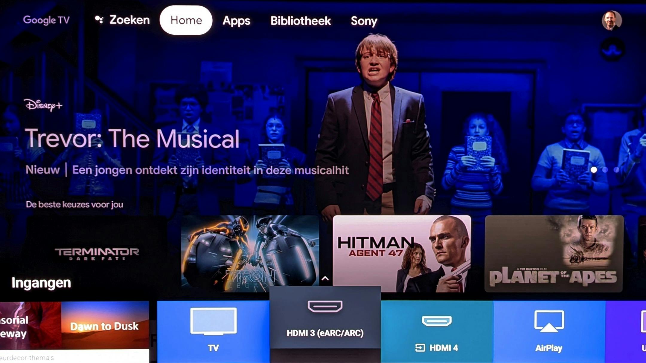 Het Google Home-scherm benadrukt duidelijk hoe belangrijk aanbevelingen zijn. Op de achtergrond is een carrousel zichtbaar met aanbevelingen (in ons geval van Disney+). Bovenaan vind je vier verschillende secties: Zoeken, Home, Apps en Bibliotheek. We merkten dat fabrikanten ook de optie hebben om daar een eigen sectie te creëren (zoals Sony, dat tips en content uit de eigen Bravia Core-app toont). Het scherm wordt verder ingenomen door een extra rij aanbevelingen van Google TV, en pas daaronder volgt de rij met je favoriete apps.