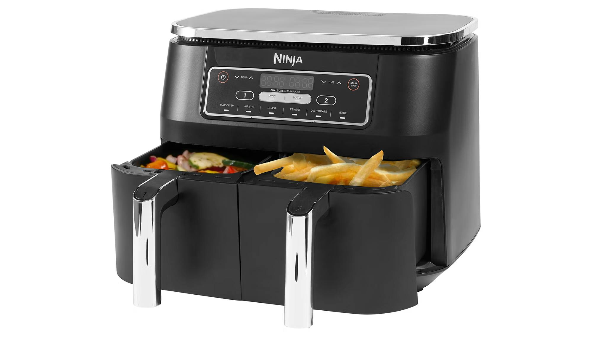 De Ninja Foodi AirFryer AF300EU heeft twee aparte baklades, zodat je friet en vlees tegelijk bereidt zonder dat iets te vroeg klaar is. Dankzij de Sync-functie lopen beide bereidingen perfect gelijk. Met zes kookstanden – van bakken en roosteren tot opwarmen en drogen – maak je met gemak een complete maaltijd voor het hele gezin. De airfryer haalt een temperatuur tot 240 graden voor extra knapperige resultaten, en na het eten gaan de losse onderdelen gewoon in de vaatwasser.