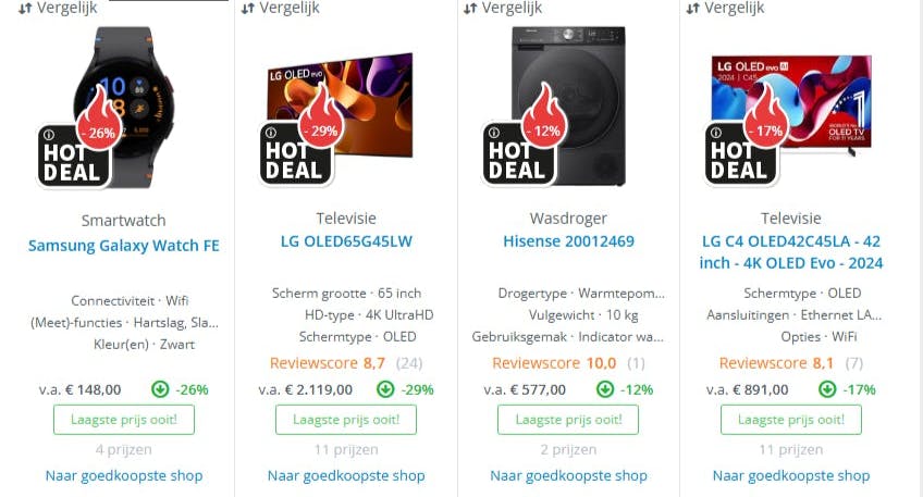 Elektronica is tijdens Black Friday vaak de categorie met de grootste prijsdalingen. Toch is het niet altijd direct duidelijk of een aanbieding écht de moeite waard is. Op Kieskeurig.nl worden prijzen nauwkeurig bijgehouden, zodat je precies weet waar je aan toe bent. Het label Laagste prijs ooit laat je zien dat een artikel daadwerkelijk flink is afgeprijsd. Bovendien zie je altijd het percentage van de korting, zodat je zeker weet dat je een goede deal hebt gevonden.