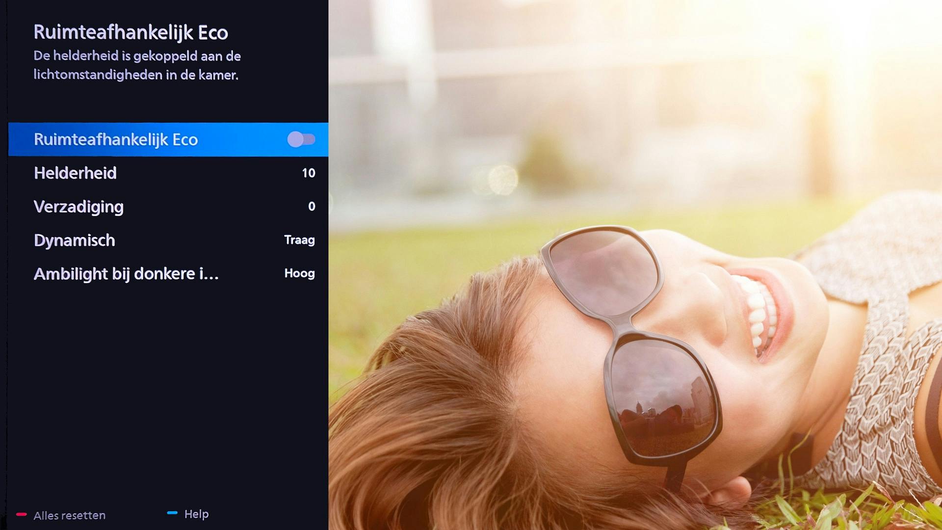 Kijk je soms bij veel omgevingslicht en soms in relatieve duisternis, activeer dan Ruimteafhankelijk eco. Zo kan Ambilight zijn helderheid aanpassen aan de hoeveelheid licht in de kamer. Helderheid bepaalt hoe helder Ambilight is, Verzadiging bepaalt hoe fel of hoe zacht de kleuren zijn. Via Dynamisch controleer je de snelheid waarmee Ambilight reageert, het is instelbaar in vier stappen. Voor games wil je misschien dat Ambilight snel reageert, terwijl je voor films liever een rustige Ambilight-ervaring wilt. Tot slot kan je ook het gedrag van Ambilight bij donkere beelden aanpassen, in vier stappen. Zo kan je Ambilight zelfs uitschakelen wanneer het beeld erg donker is.