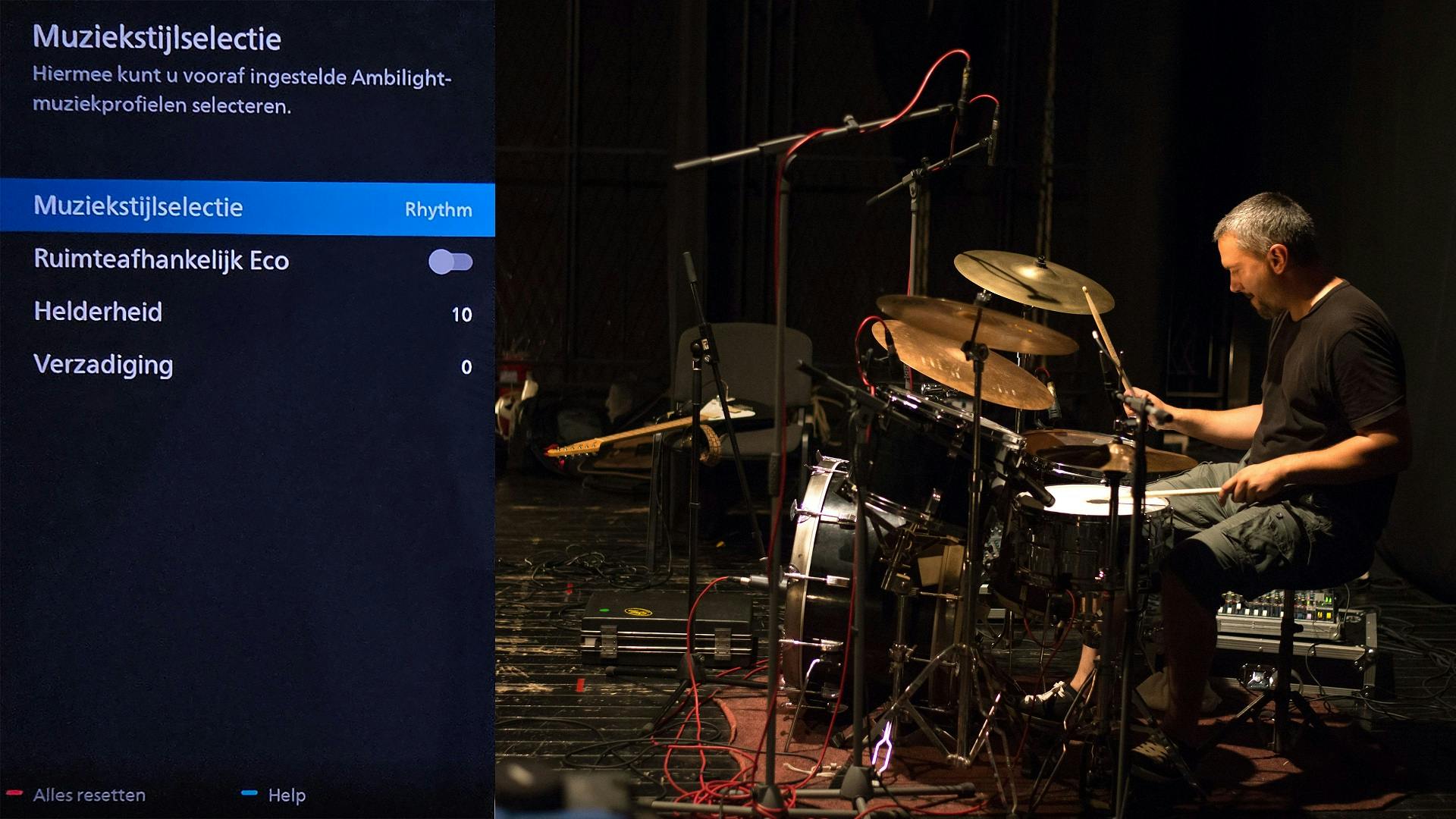 Vervolgens zijn er nog twee speciale presets die wat andere opties bieden. De Muziek-instelling reageert op de dynamiek van het geluid, en creëert zo lichteffecten op basis van je geluid; erg handig wanneer je een feest geeft. Bij de Vaste kleur-instelling kies je een kleur die niet verandert. Deze instelling kan dienen als een bias-light, iets wat overigens het originele doel was van Ambilight. Wie kijkt bij verduistering kan last krijgen van vermoeide ogen als het beeld vaak wisselt tussen donker en helder. Door een bias-light rond het scherm te gebruiken, liefst een neutraal wit, geef je je ogen een vaste referentie, waardoor je minder snel last hebt van vermoeide ogen.