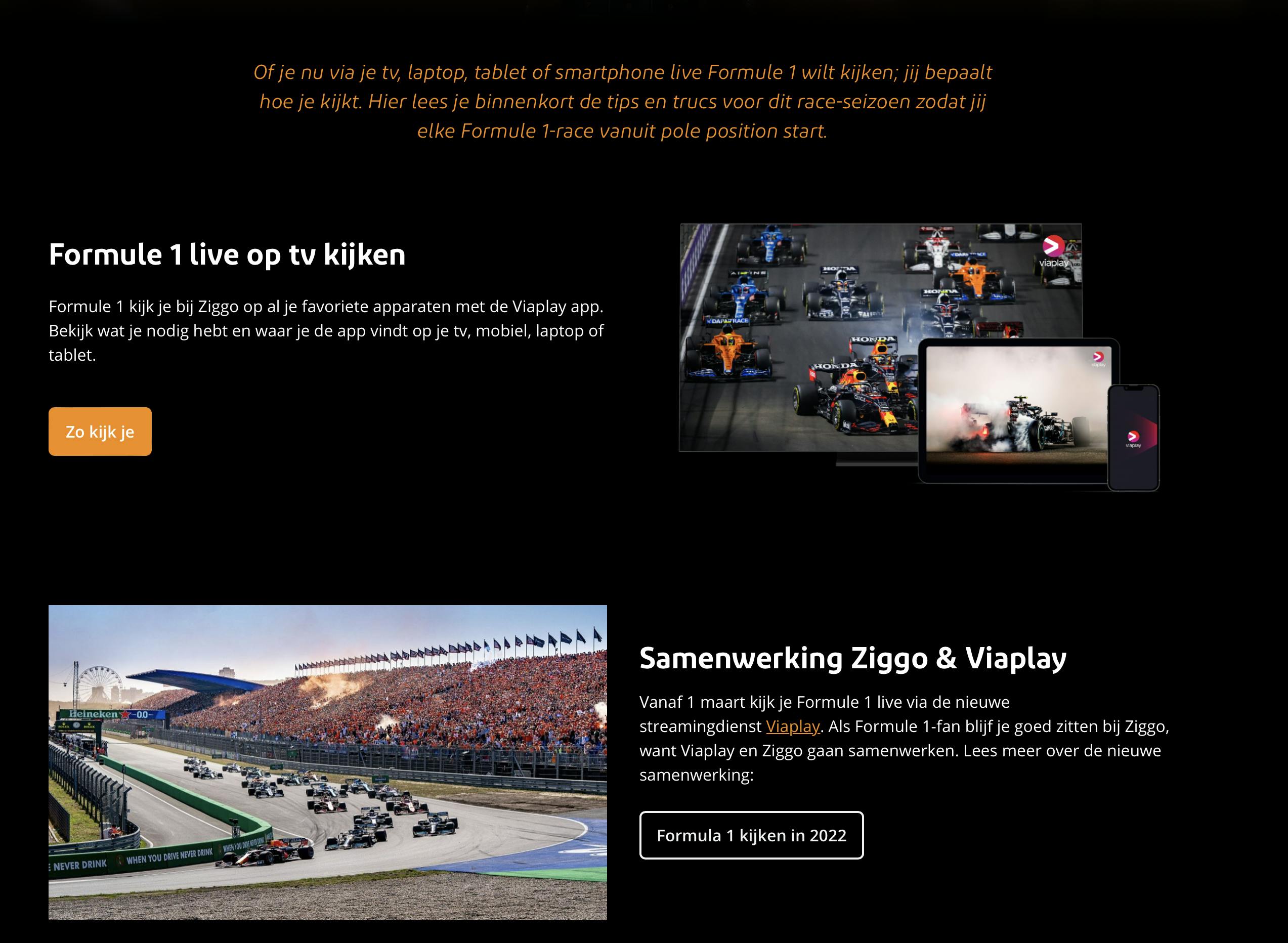 De samenvattingen van alle races, trainingen en kwalificaties kun je ook gewoon via Ziggo Sport blijven kijken. Ziggo geeft aan dat ze een goede samenwerking aangaan met Viaplay en je kunt dus ook via Ziggo een Viaplay-abonnement afsluiten, maar je zult hiervoor dan wel van zender moeten wisselen. Viaplay is een aparte dienst op een aparte zender.