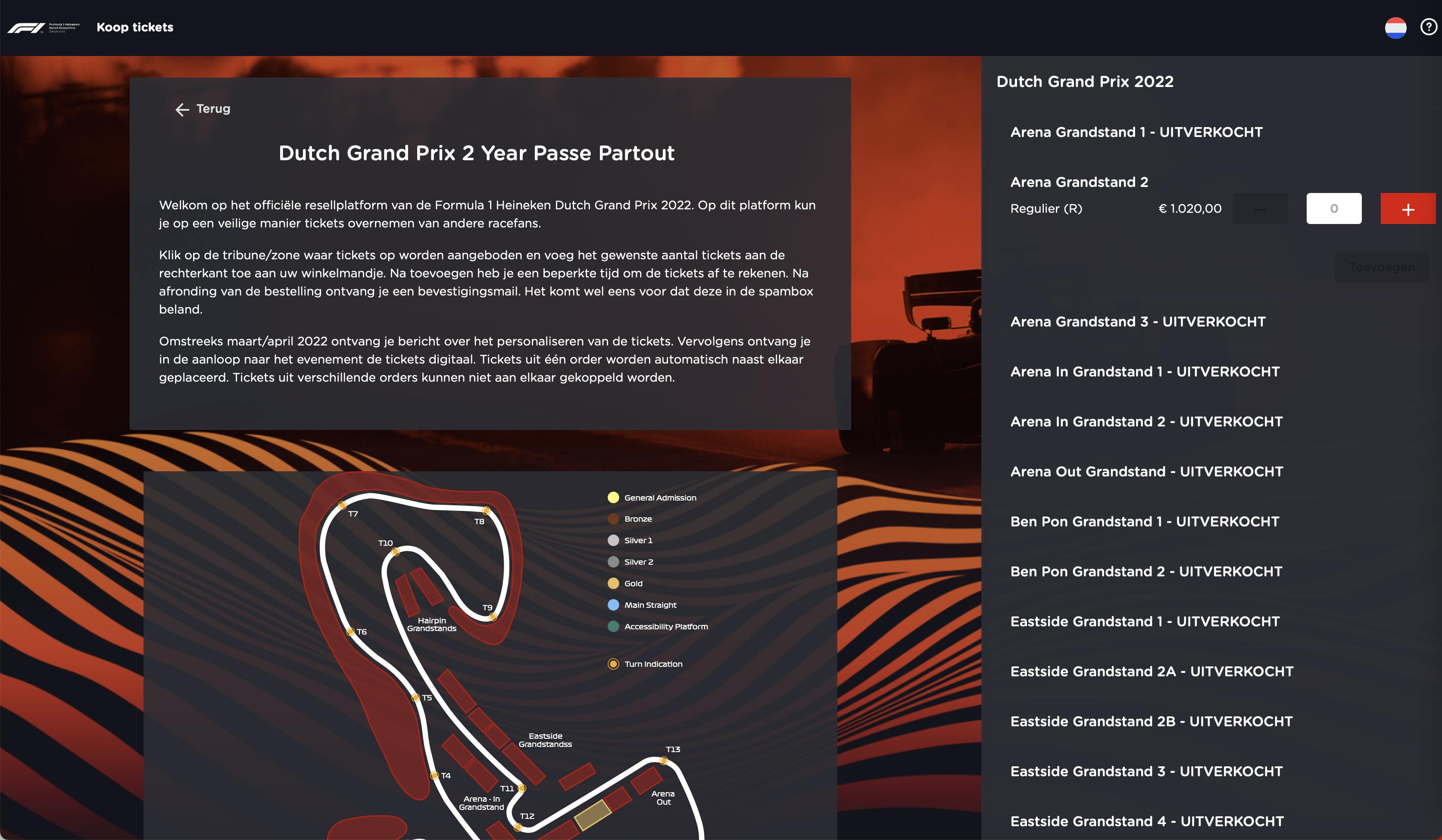 De mooiste ervaring om een F1-race te kijken is natuurlijk om er heen te gaan. Zandvoort is de makkelijkste optie, maar de reguliere tickets zijn al uitverkocht. Op de officiële website www.dutchgp.com kun je nog wel zogenaamde resell-tickets krijgen, dit zijn entreekaarten die door de tickethouders voor (duurdere) prijzen worden verkocht. Klik op Bekijk Resell Platform en je wordt naar de site geleid. Klik op één van de opties en je ziet of er nog tickets beschikbaar zijn.