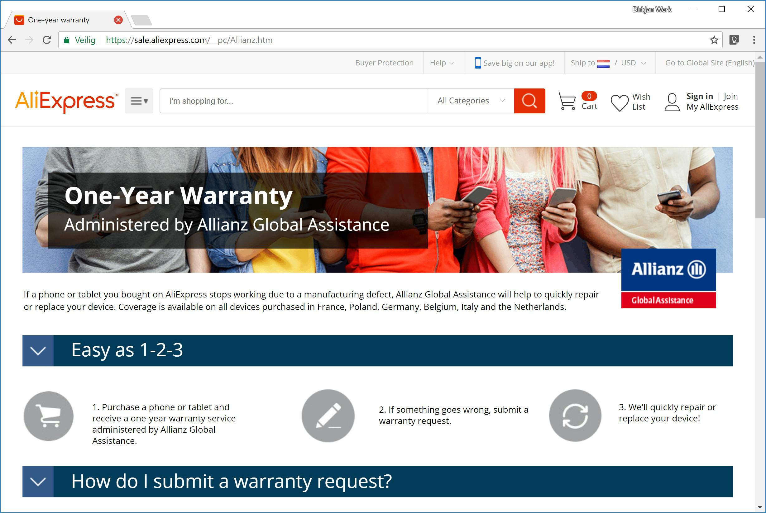 Wie een product koopt buiten de Europese Unie, heeft te maken met de regels van het land van aankoop. Met een uitzondering: als de buitenlandse winkel zich nadrukkelijk richt op de Nederlandse markt, gelden dezelfde regels als in Nederland. Beroep op garantie in het buitenland is altijd lastiger dan bij een Nederlandse winkel. Niet alleen door de afstand, maar ook door de taalbarrière. Dat geldt zeker voor Chinese webwinkels. Om Europese klanten tegemoet te komen heeft het Chinese AliExpress wel geregeld dat smartphones en tablets een jaar garantie hebben. Dit wordt afgehandeld door verzekeraar Allianz. Voor andere producten is het afwachten hoe er met garantie wordt omgegaan. Houd sowieso rekening met een lange reparatietijd. Ook moet je soms een video toesturen waarin je het defect bewijst. Wie koopt in Amerika vindt bij Amazon de nodige informatie over garantie, maar ook hier geldt dat het versturen van een kapot product voor vertraging kan zorgen.