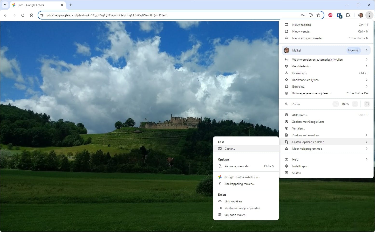 Je gaat nu het huidige browsertabblad naar de televisie casten. Klik in de werkbalk van Chrome rechtsboven op de drie puntjes. Er komt een uitgebreid menu tevoorschijn. Via Casten / opslaan en delen kies je Casten. Klik nu op de naam van de kamer of televisie. Een kopie van het browsertabblad is direct op de televisie te zien. Je gebruikt de pijltjestoetsen om de beelden een voor een te tonen. Met behulp van de drie puntjes in Google Foto’s open je een diavoorstelling.
