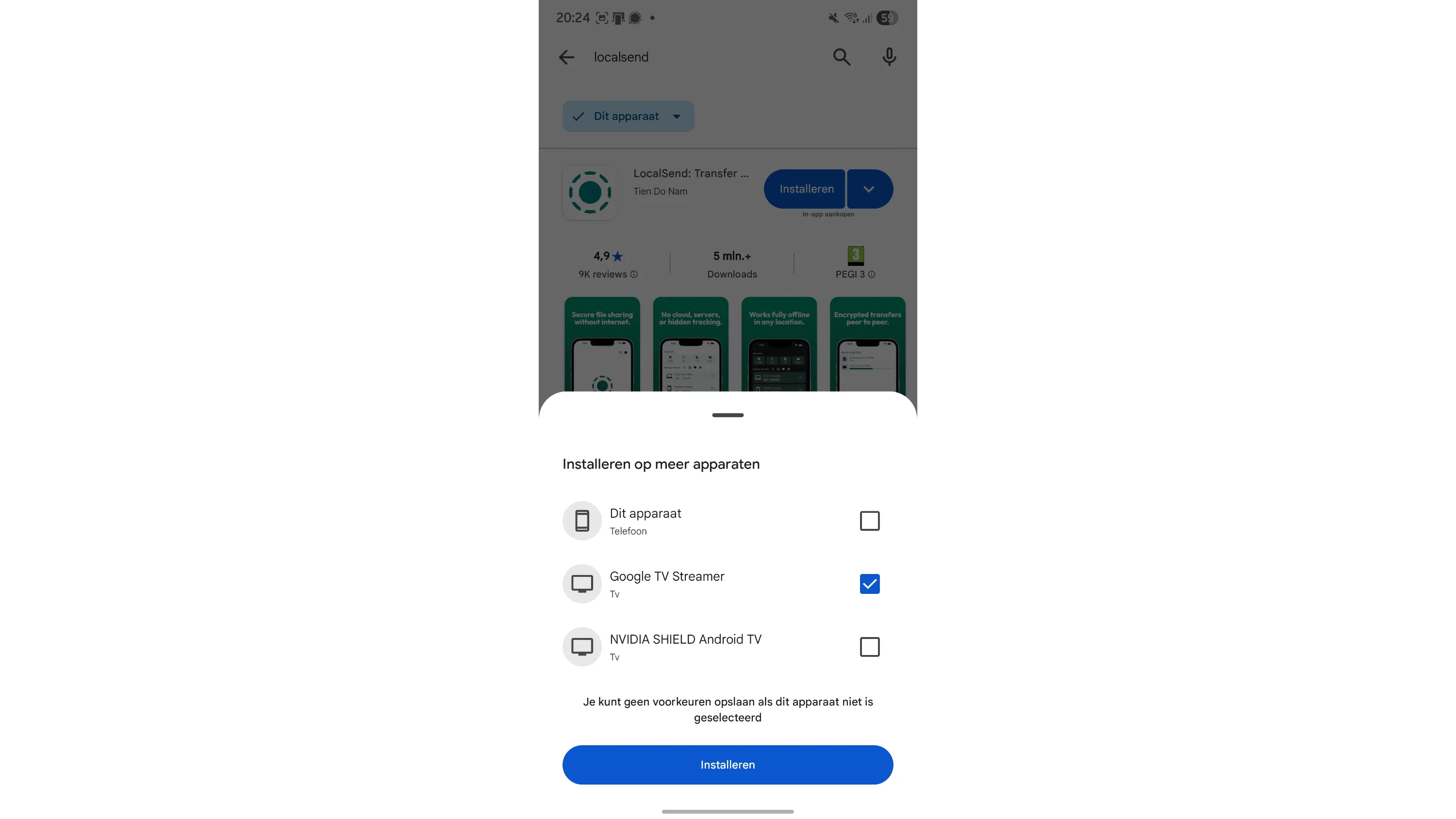 Ga naar Google Play op een Android-toestel en zoek de app die je wilt installeren. Klik op de pijl naast Installeren. Een overzicht verschijnt van alle apparaten waarvoor de betreffende app geschikt is. Kies bijvoorbeeld Google TV Streamer en dan Installeren.