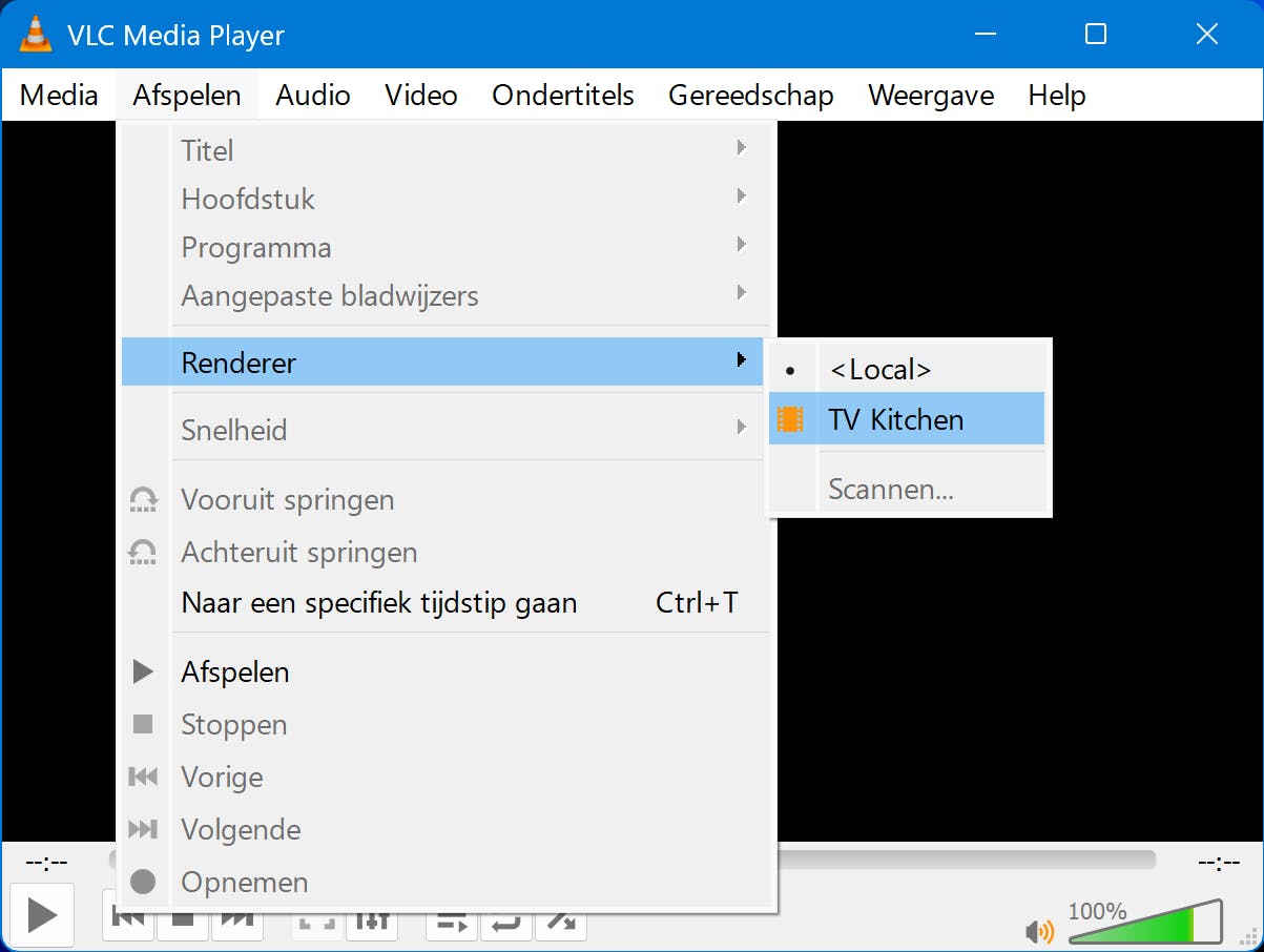 Installeer je de app ook op Google TV, dan beschik je over een aantal interessante mogelijkheden. Prettig is bijvoorbeeld de mogelijkheid om lokale media (bijvoorbeeld van een laptop) direct af te spelen op de televisie. Zorg dat je VLC op zowel de laptop als op Google TV hebt geïnstalleerd. Open op de laptop het videobestand in VLC en kies Afspelen / Renderer. Wijs nu de Google TV aan. Het beeld verschijnt direct.