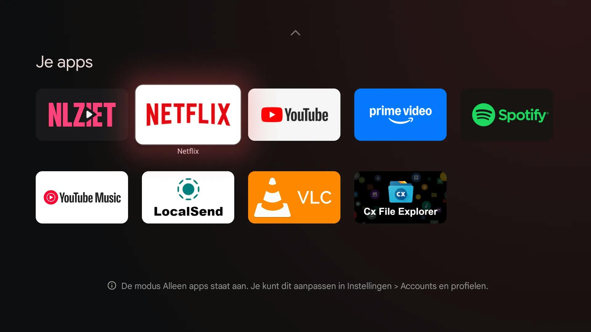 Het startscherm van Google TV bevat ‘aanbevelingen’ en advertenties. Heb je hieraan geen behoefte, dan kun je overstappen op een alternatieve launcher, waarvoor je in de vorm van Dispatch elders in dit artikel een alternatief ziet. Ben je gehecht aan de ingebakken launcher van Google TV, dan kun je deze ook flink afslanken en bruikbaar maken. In de modus Alleen apps beperkt de weergave zich tot de apps die je hebt geïnstalleerd. Aanbevelingen en andere extra’s worden zoveel mogelijk verborgen. Open de instellingen (via het tandwiel) en kies Accounts en profielen. Kies je profielnaam en activeer de optie Modus ‘Alleen apps’.