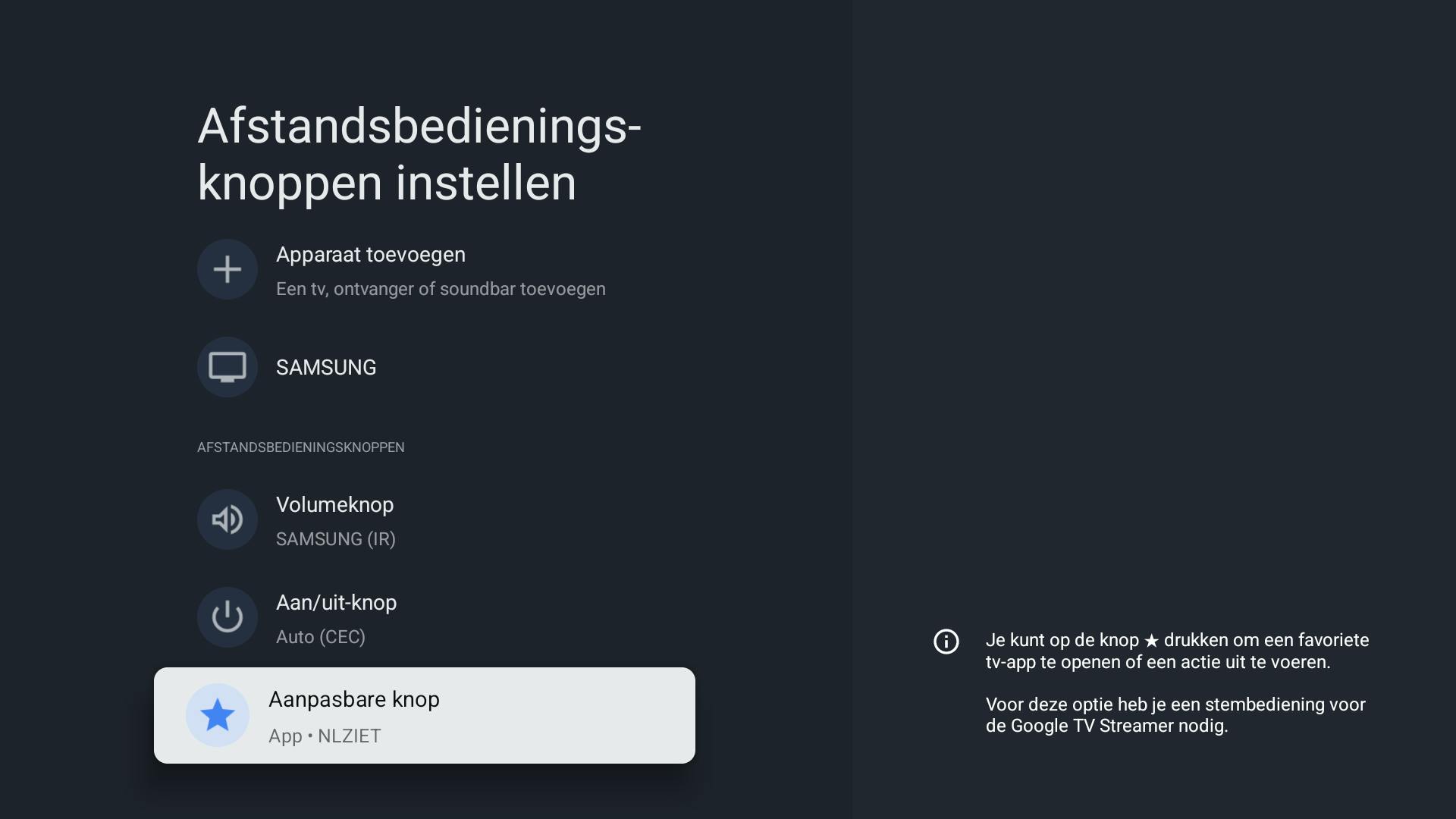 Grote kans dat je na het toevoegen van nieuwe apps een specifieke app in de praktijk vaak gebruikt. Heb je een Google TV Streamer? Je kunt op de afstandsbediening van Google TV Streamer een knop toewijzen aan de app. Open de instellingen en kies Afstandsbedieningen en accessoires. Kies Afstandsbedieningsknoppen instellen / Aanpasbare knop. Bepaal vervolgens welke actie je met deze knop wilt uitvoeren, bijvoorbeeld het openen van een favoriete app.