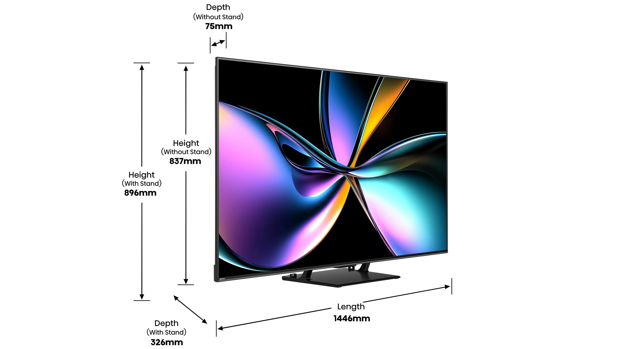 Adviesprijs: 1.399 euro Wat: Ultra HD LCD-tv (MiniLED FALD met 560 zones) Schermformaat: 65 inch (164 cm) Aansluitingen: 4x HDMI (v2.1, eARC/ARC, ALLM, VRR, 4K120), 1x minijack (composiet video + stereo), 1x optisch digitaal uit, 2x usb, 1x hoofdtelefoon, 2x antenne, 1x ethernet, wifi 5 (802.11b/g/n/ac), bluetooth Extra's: Dolby Vision IQ with Precision Detail, HDR10+ Adaptive, HDR10, HLG, VIDAA U9 OS, USB/DLNA-mediaspeler, AirPlay 2, DVB-T2/C/S2, CI+-slot Afmetingen: 1446 x 896 x 326 mm (incl. voet) Gewicht: 21,6 kg (incl. voet) Verbruik: SDR 84 kWh/1000h (E) / HDR 180 kWh/1000h (G)