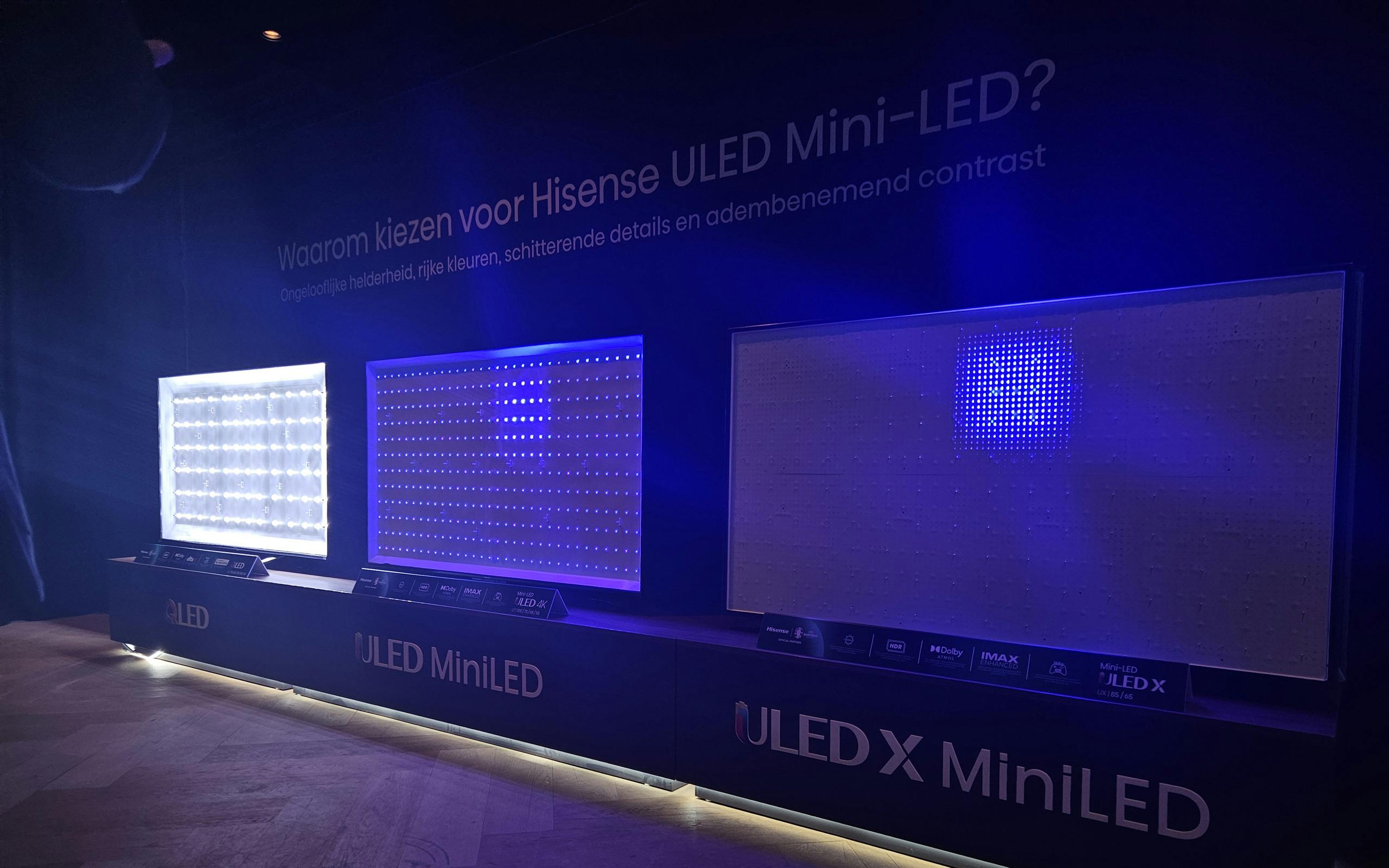 De mini-led achtergrondverlichting is te onderscheiden in drie merkvarianten Mini-LED X (voor de UXN), Mini-LED Pro (U8N en U7N) en Mini-LED (U6N). Hisense had een opstelling met opengewerkte tv's staan, waar de Mini-LED X, Mini-LED en QLED (zonder zones) getoond werden. Het verschil is enorm, en verklaart ook duidelijk waar de verbeteringen in prestaties vandaan komen.