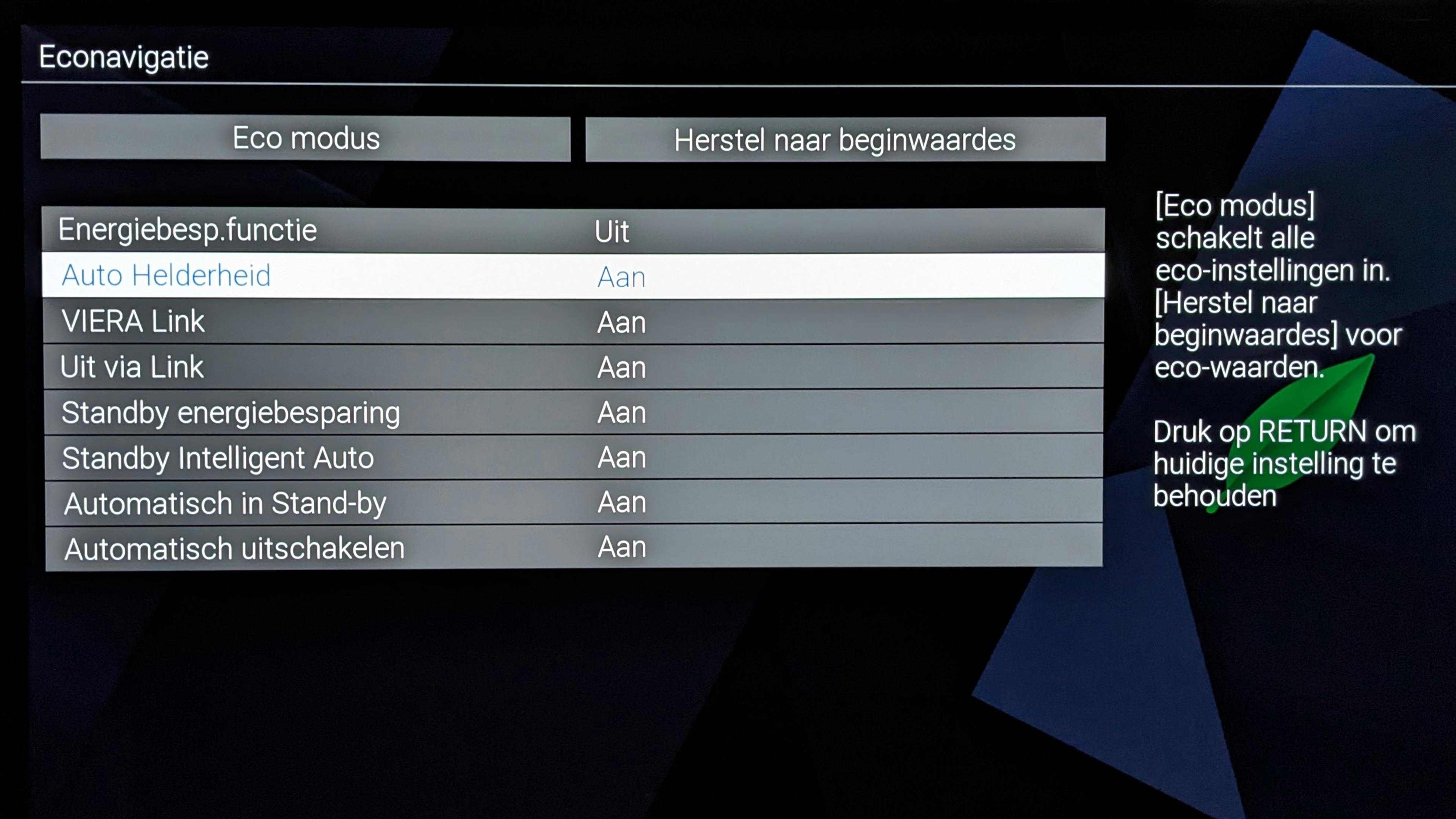 Het aanpassen van de helderheid aan de omgevingsverlichting in de kamer kan helpen energie te besparen. De lichtsensor in de tv is daarbij je beste vriend, want die doet dat automatisch voor je. Over het algemeen vind je in de eco-instellingen ook andere energiebesparende instellingen. Die verminderen het energieverbruik effectief, maar verlagen vaak ook de schermhelderheid.