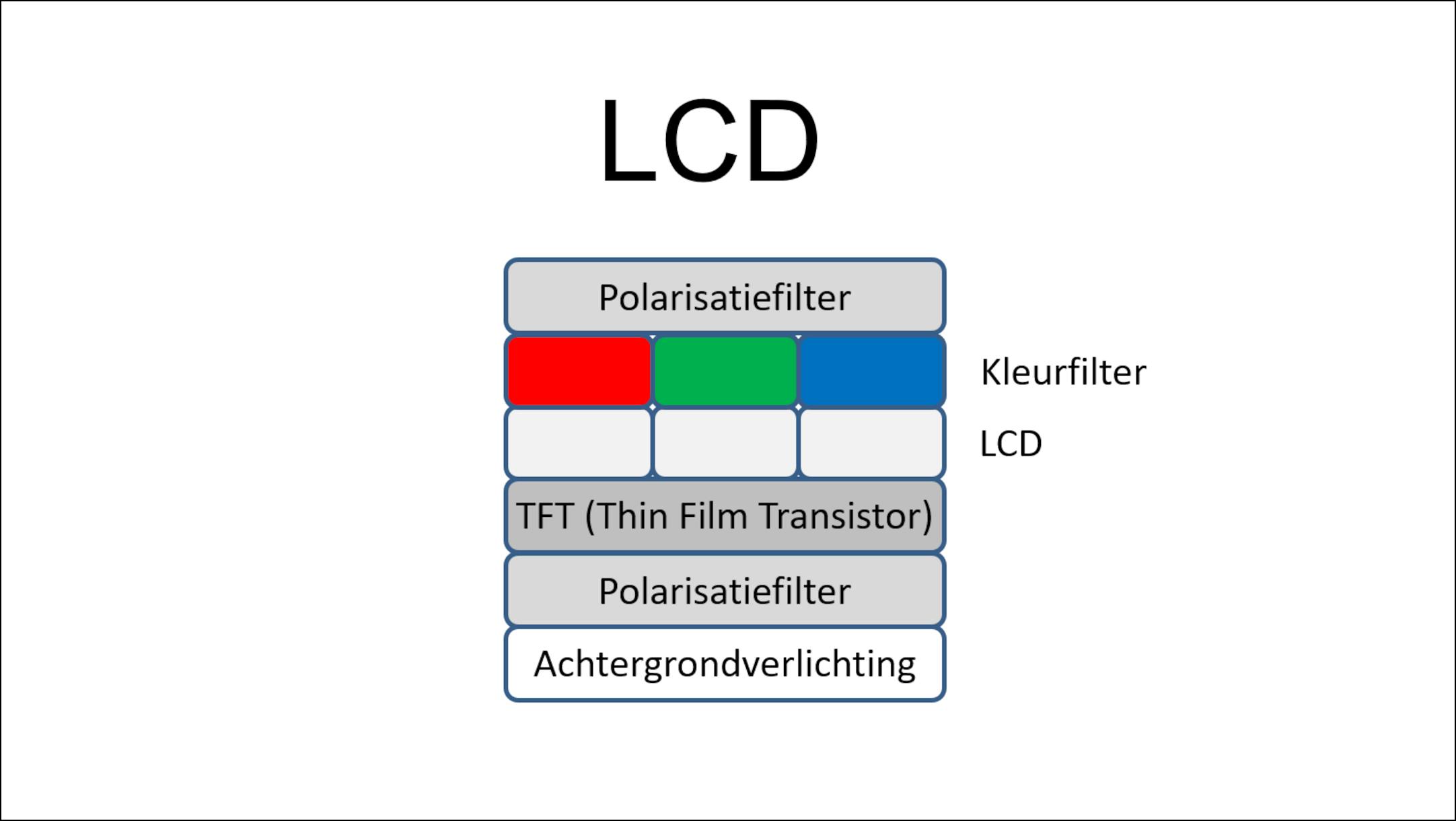 De lichtbron aan de achterzijde van een lcd-scherm gaat eerst door een zogeheten polarisatiefilter, dat ervoor zorgt dat het licht één bepaalde richting op gaat. Vervolgens gaat het licht door een een laag vloeibare kristallen. Deze kristallen kunnen draaien wanneer er een elektrische stroom op wordt gezet door de Thin Film Transistor (TFT)-laag.