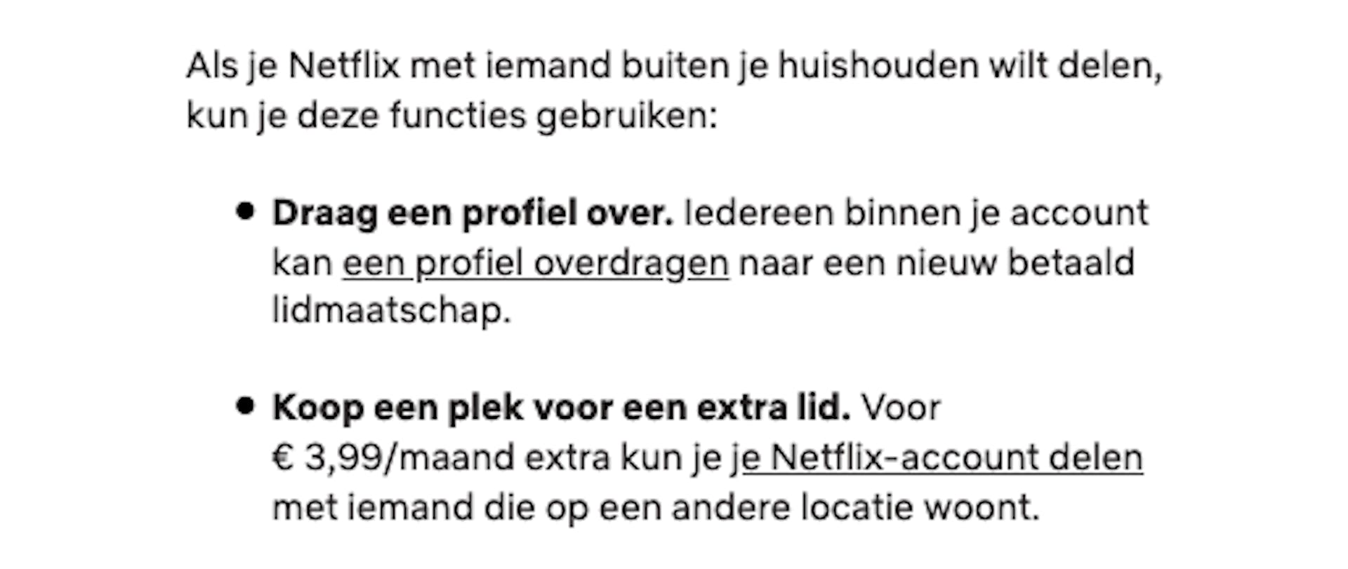 Het schijnt dat ongeveer een derde van de Nederlandse Netflix-gebruikers hun account met anderen deelt. Met de nieuwe regels hoopt Netflix dat een groot deel van deze kijkers alsnog een extra bedrag gaan bijbetalen. Of dat ook echt het geval is, moet nog maar blijken; in april van dit jaar raakte Netflix in Spanje zo'n 1 miljoen gebruikers kwijt nadat het daar ook een extra verhoging van het maandbedrag doorvoerde voor gebruikers die hun account deelden. Daar ging het overigens over een hoger bedrag: € 5,99 per maand.