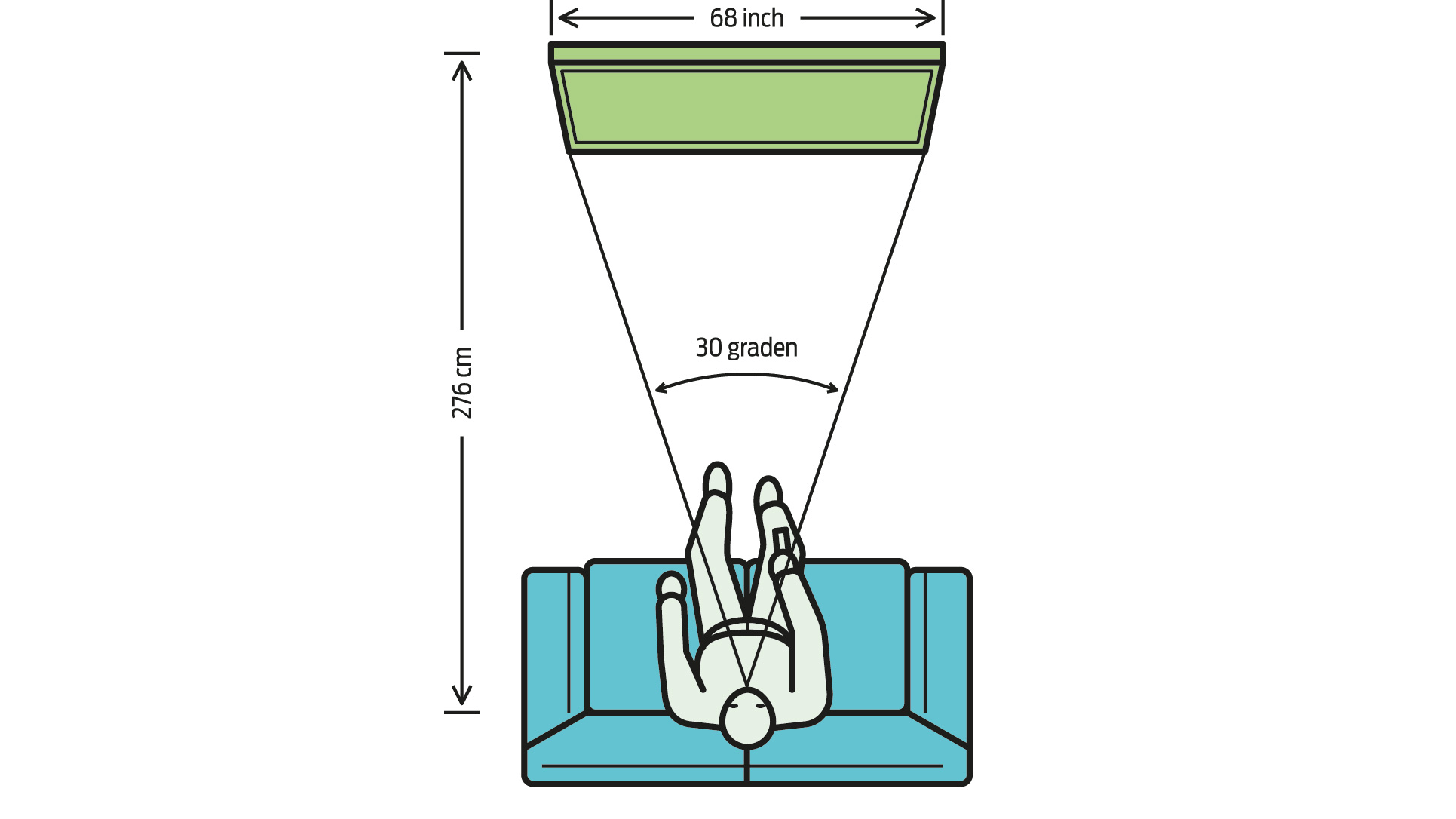 Mocht je voor een bioscoopervaring gaan, waarbij het beeld een zeer groot deel van je blikveld vult, kies dan voor een verhouding van 1 tot 1,5.
