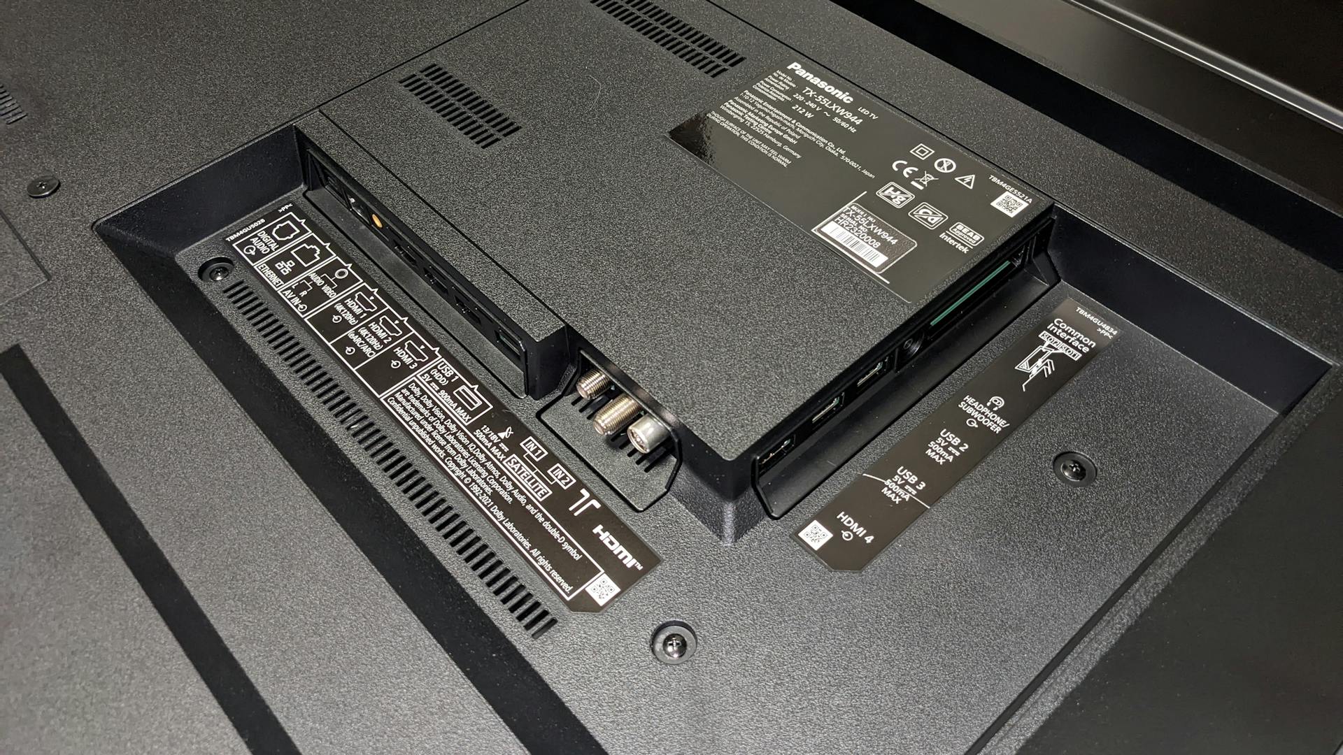 De tv is rijkelijk voorzien van aansluitingen. De connectoren wijzen allemaal naar opzij of naar onder, dus een strakke wandmontage is gemakkelijk te realiseren. Van de vier HDMI-aansluitingen zijn er twee die een HDMI 2.1-bandbreedte leveren (40 Gbps). Ze ondersteunen ARC/eARC, ALLM, 4K120 en VRR. Verder vinden we drie USB-aansluitingen, een composiet video en stereo cinch ingang, en optisch digitale audio-uitgang.