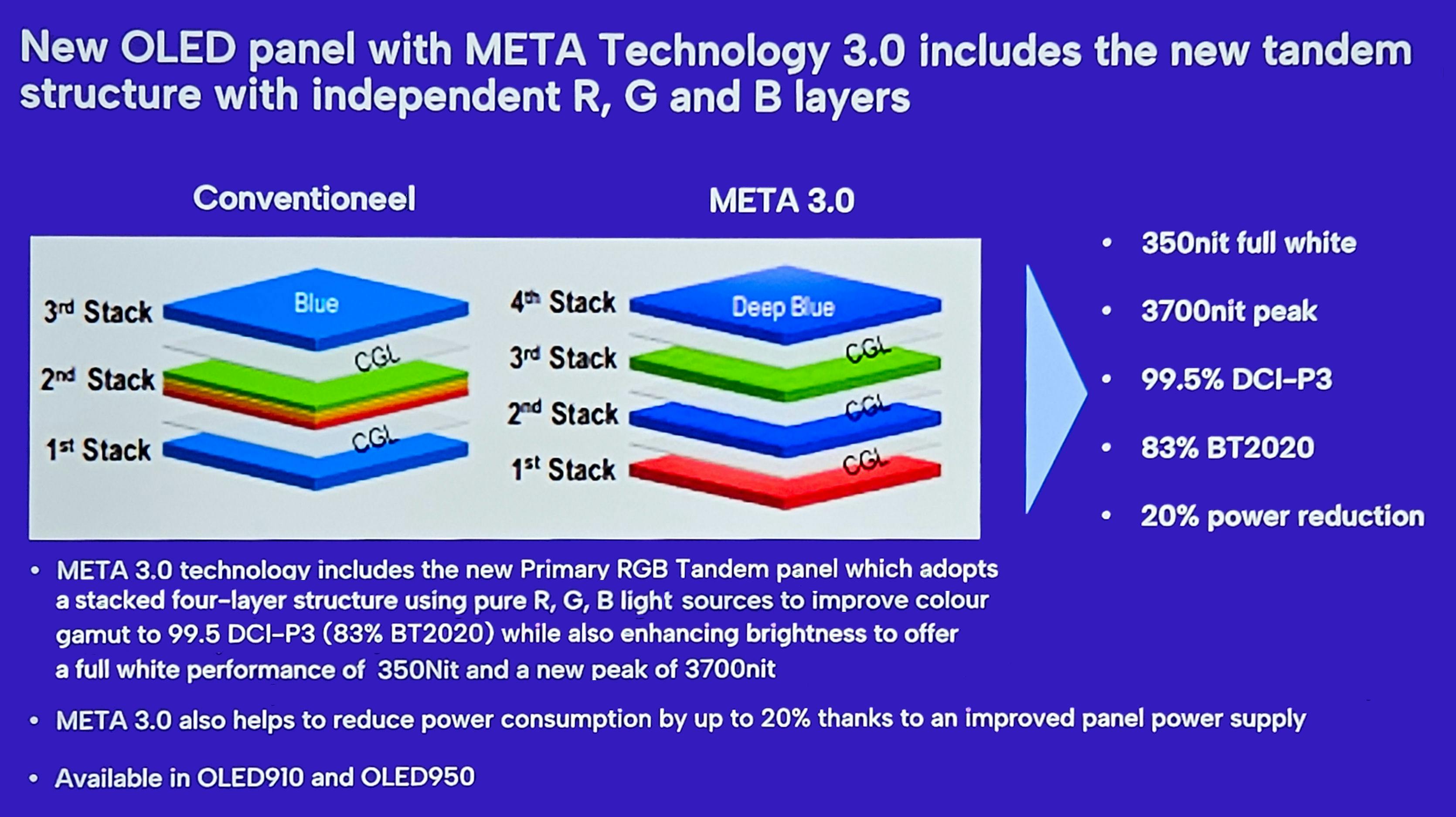 In de topmodellen, OLED+950 en OLED+910, gebruikt Philips een gloednieuw META 3 oled-paneel. Dat gebruikt niet langer microlenzen, maar heeft nieuwe oled-materialen die de piekhelderheid aanzienlijk verbeteren. Op een klein schermoppervlak (10%) kan het paneel tot 3700 nits leveren en op een volledig scherm zelfs 350 nits. Dat zijn aanzienlijke verbeteringen tegenover vorig jaar (3000/250). Bovendien zouden deze panelen energiezuiniger zijn.
