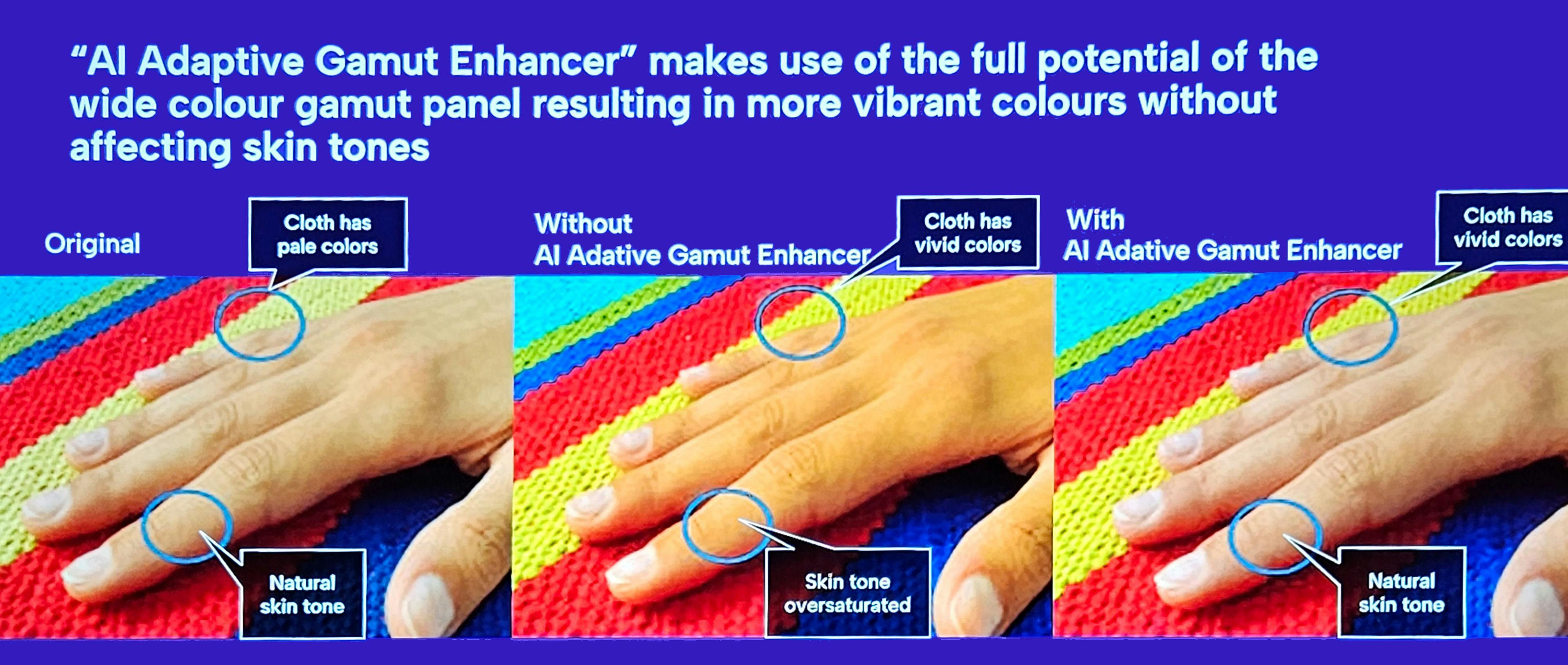 AI Adaptive Gamut: Uit de gegevens waarover TP Vision beschikt, blijkt dat ongeveer 95% van de kijkers naar SDR-bronmateriaal kijkt. Het ruimere kleurbereik van deze tv’s wordt daarbij niet benut. AO Adaptive Gamut maakt de kleuren van SDR-beelden rijker en intenser, maar beschermt de huidskleuren die anders erg onnatuurlijk zouden zijn. Zo benut je toch de volledige capaciteit van je toestel. Bovendien kan je via de instellingen zelf aanpassen hoe sterk het effect is.