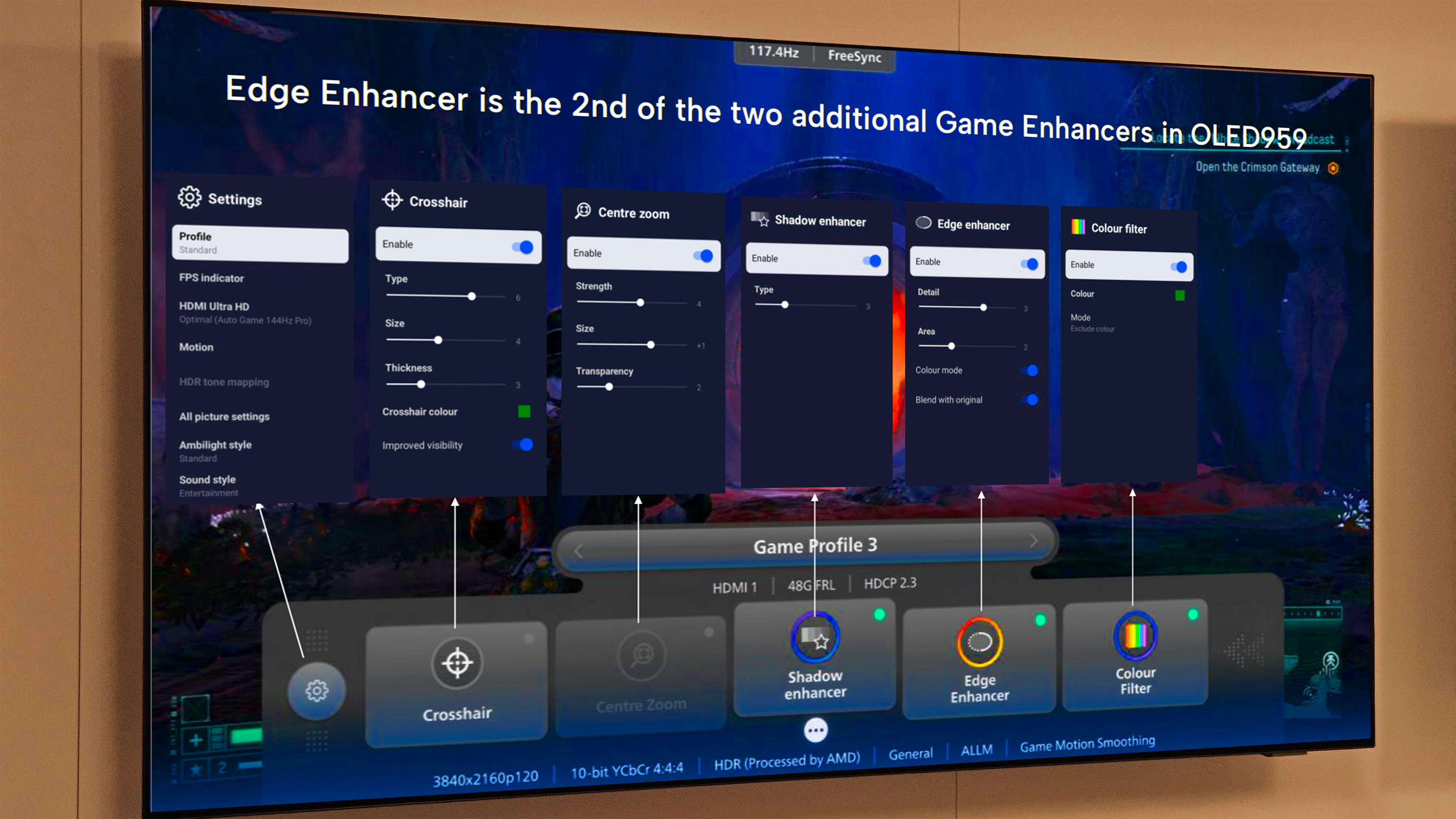 Elke tv heeft een Game Bar waar je basisinformatie over het spelbeeld kunt zien zoals FPS (frames per second), HDR en de resolutie. Vaak zijn er ook opties om de beeldkwaliteit wat aan te passen voor bepaalde spelgenres. Maar TP Vision heeft de kracht van de P5 Dual Engine gebruikt om een paar unieke mogelijkheden aan te bieden. Met Center Zoom kun je op een klein stukje centraal in beeld inzoomen, en dat is uiteraard ideaal voor schietgames met snipers. Edge Enhancer detecteert alle randen in beeld en accentueert die, en met Colour Filter filter je bepaalde kleuren uit beeld.