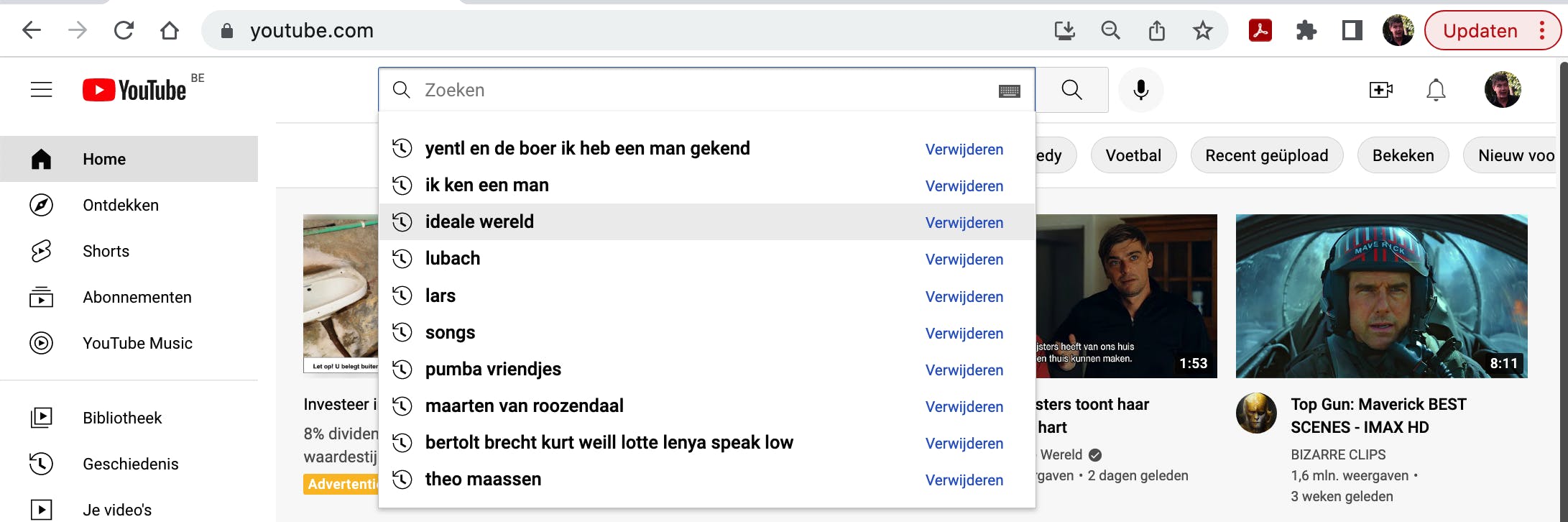 Je hebt bijvoorbeeld je telefoon of iPad aan je kind gegeven. En je vindt het niet prettig dat in de geschiedenis de Peppa Big-video’s je eigen feeds verdringen. Of je wilt dat de suggesties professioneel blijven. Het verwijderen van je YouTube-geschiedenis is eenvoudig. Je kunt individuele zoektermen, bepaalde geschiedenisitems of de volledige kijkgeschiedenis wissen. Op de pc klik je in de zoekbalk van YouTube. Daar verschijnen al je recente zoektermen in een vervolgkeuzelijst. Klik op de knop Verwijderen naast het zoekitem dat je wilt verwijderen.