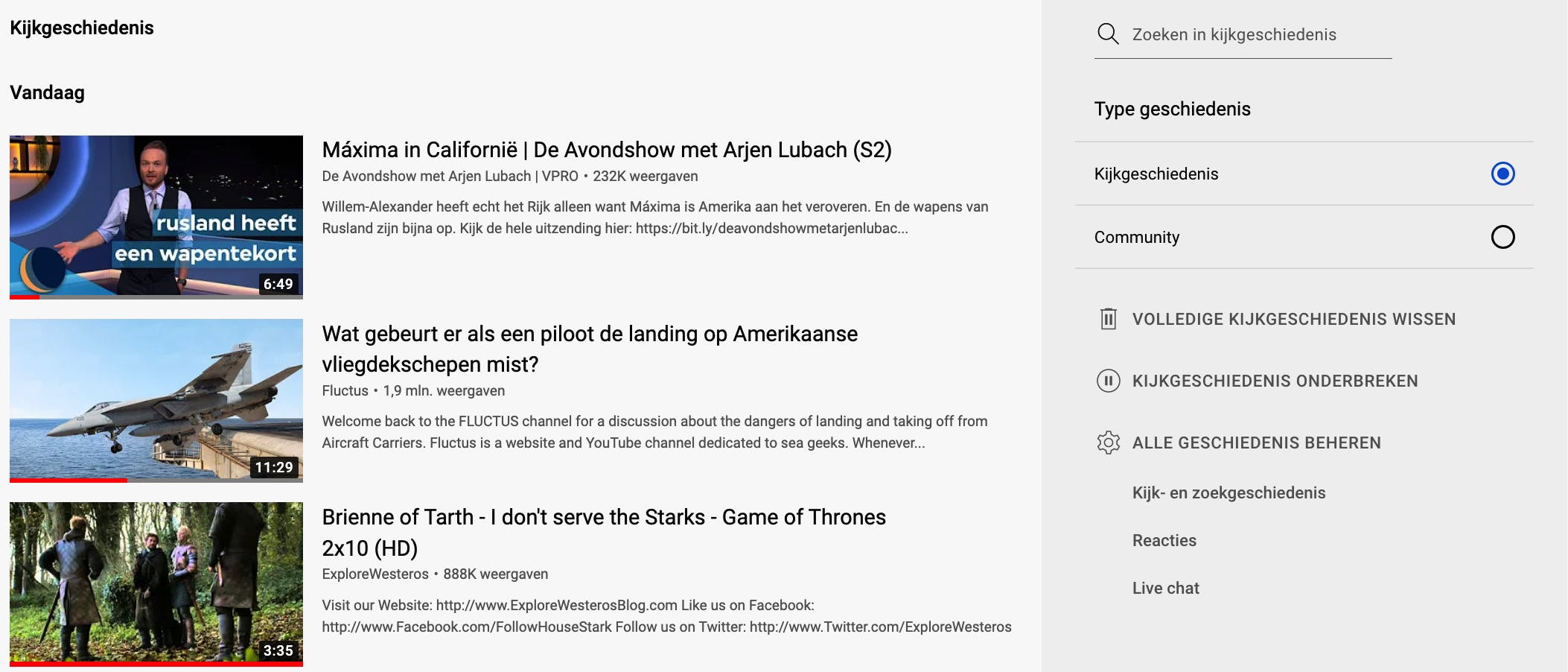 Om de recente kijkgeschiedenis te verwijderen gebruik je het tabblad Geschiedenis in de zijbalk. Klik op het X-teken naast de video die je in de zoekgeschiedenis wilt weghalen. Dat X-teken komt pas tevoorschijn als je met de muisaanwijzer over het miniatuur gaat. In het tabblad Geschiedenis kun je aan de rechterkant ook de knop Volledige kijkgeschiedenis wissen gebruiken. Daaronder staat een knop om het bijhouden van de kijkgeschiedenis tijdelijk te onderbreken tot je deze functie via dezelfde weg opnieuw activeert. En als je op Kijk en zoekgeschiedenis klikt, dan krijg je per dag de geschiedenis te zien en ook hier kun je de items verwijderen. Bovenaan deze pagina staat trouwens de functie Je YouTube-geschiedenis wordt automatisch opgeslagen. Die instelling kun je hier uitzetten.