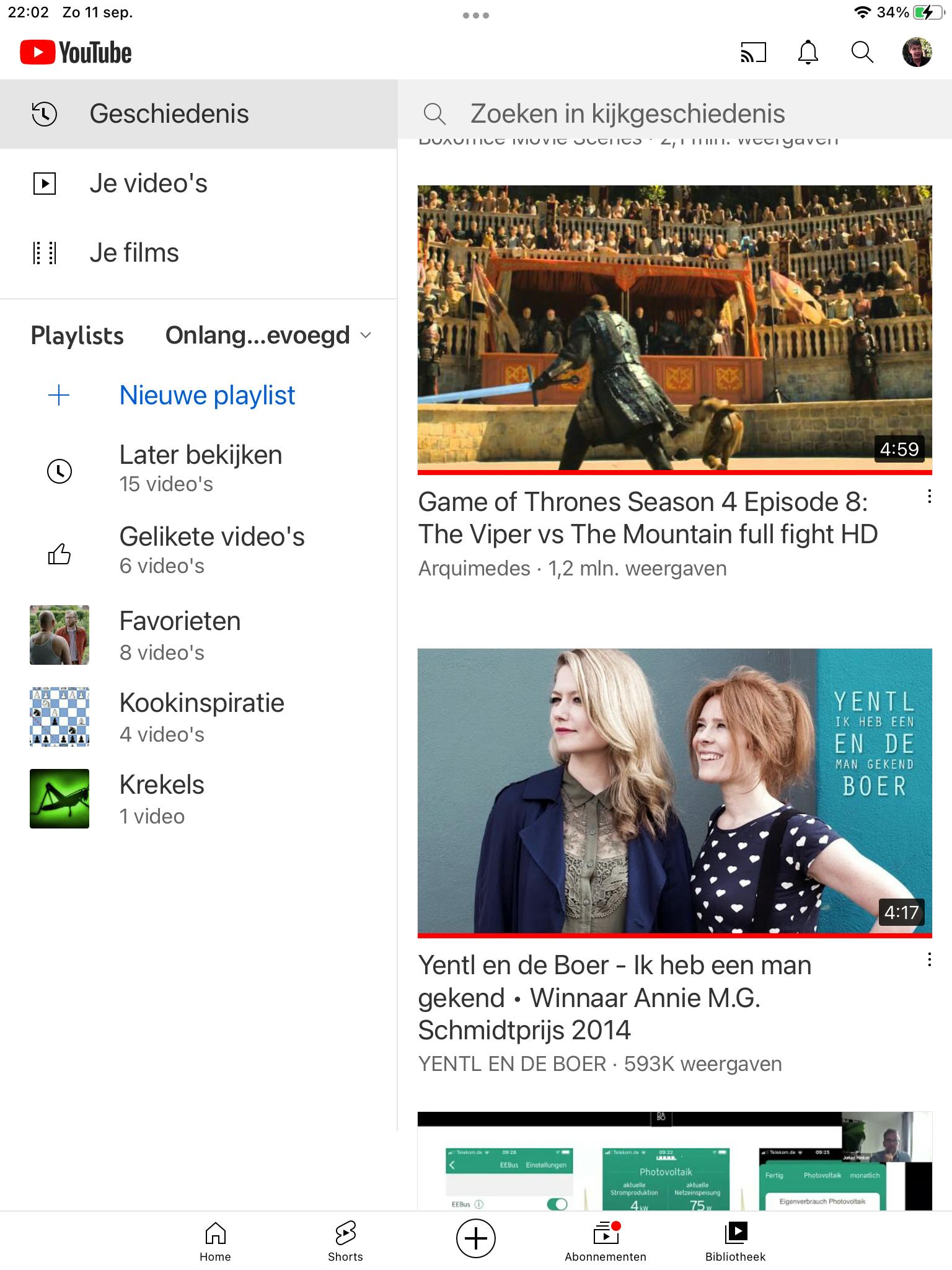 Op een mobiel toestel gaat het bijna op dezelfde manier. Je bekijkt de geschiedenis door op het zoekvak te tikken en daarna kun je de zoekitems verwijderen. In de YouTube-app tik je onderaan op Bibliotheek en ook dan kun je het tabblad Geschiedenis openen. Door op de drie puntjes in de rechterbovenhoek van een miniatuur te tikken, kun je items verwijderen. Om de volledige kijkgeschiedenis te verwijderen, tik je op profielpictogram in de rechterbovenhoek en dan ga je naar Instellingen / Geschiedenis en privacy en ook daar kun je de kijkgeschiedenis en de zoekgeschiedenis wissen en het bijhouden van de geschiedenis tijdelijk onderbreken.