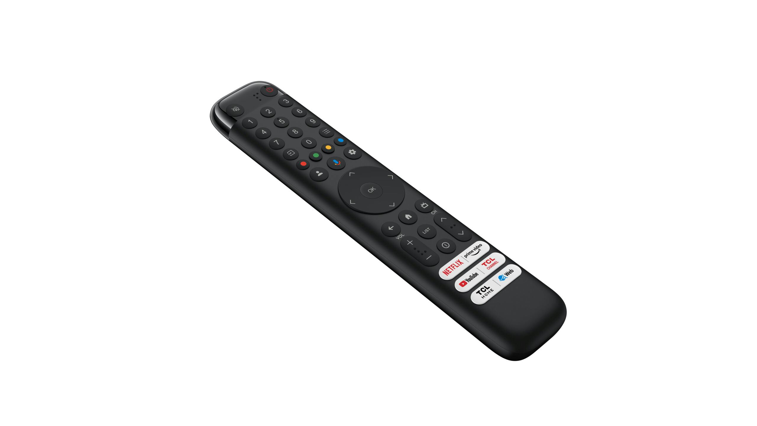 TCL heeft ook de afstandsbediening aangepast. Op designvlak sluit die aan bij de vorige remote, een lange smalle, afgeronde vorm met handige en zacht te bedienen toetsen. Het is de layout die aangepast is. De afstandsbediening heeft opnieuw een numeriek toetsenblok en een aantal toetsen zijn van plaats verwisseld zodat de bediening terug iets intuïtiever is.