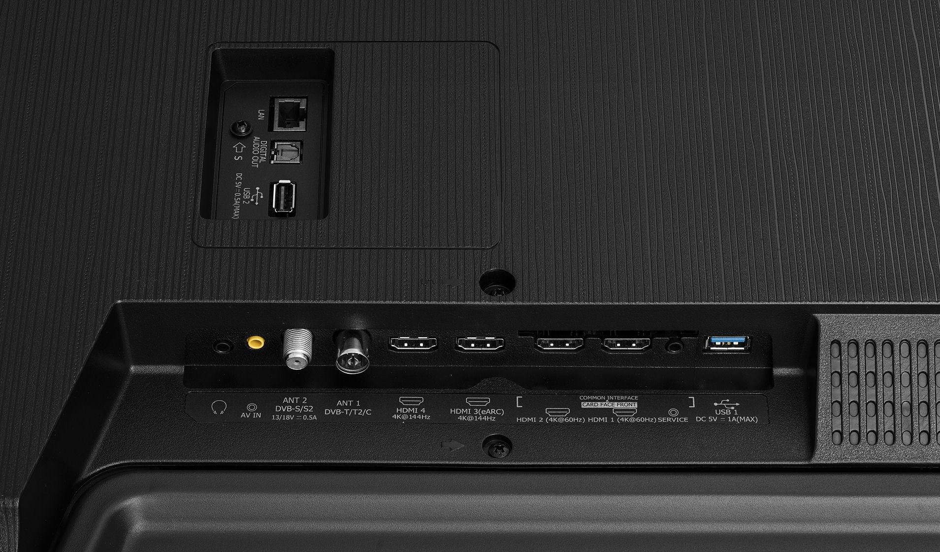 ARC/eARC is beschikbaar op een van de HDMI 2.1-poorten, dus wie een soundbar aansluit, houdt slechts één HDMI 2.1-poort over voor high end-gaming. Verder krijg je twee usb-poorten, een mini-jack ingang voor composiet video en stereo, hoofdtelefoonaansluiting, optisch digitale audio-uitgang, ethernet en Bluetooth. De tv heeft een enkelvoudige DVB-T/T2/C-tuner, een DVB-S/S2-tuner en een CI+-slot. Sluit externe usb-opslag aan als je tv wil pauzeren of opnemen.