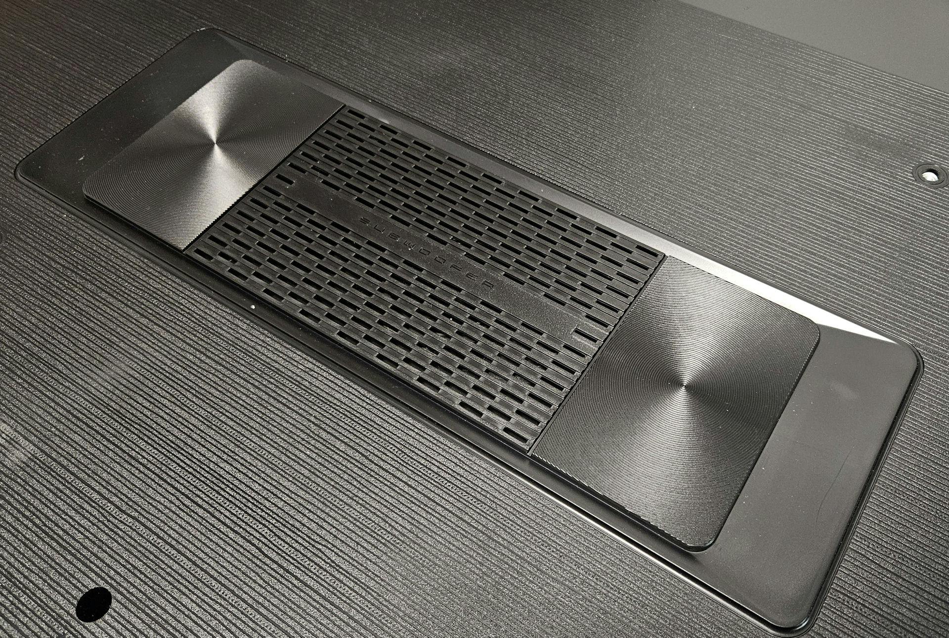Aan de voorzijde is alles nog prima, het fijne metalen kader zal niemand storen. Maar in het profiel en aan de achterzijde worden de besparingen wat duidelijker. Hij is ongeveer 8cm diep, met een vrij hoekig profiel, en ietwat industrieel ogende verstevigingsribben aan de achterzijde. De centrale voet bestaat uit twee voetsteunen die afgedekt zijn met een wat goedkope kunststof plaat. Hij kan niet in hoogte versteld worden, maar laat wel voldoende ruimte voor een soundbar.