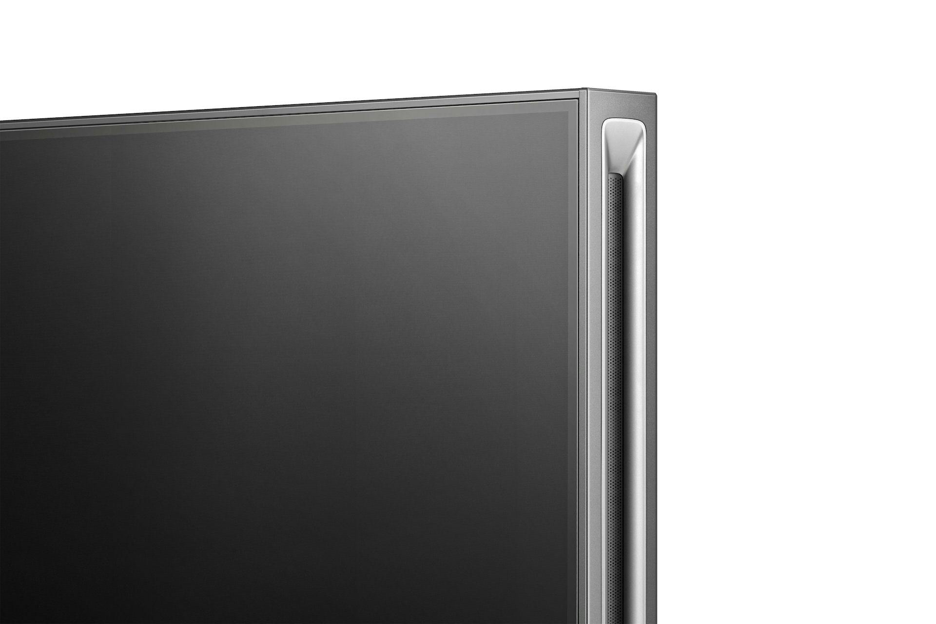 Van een televisie met een hoog prijskaartje als deze moet toch wel een aantrekkelijk design hebben. Meer nog dan bij kleine modellen is het beeld zo overweldigend dat je liefst van al zo min mogelijk kader ziet. Zo geeft het grote beeld een nog sterkere indruk. Een klein kader dus, met als enige accent de zijkanten die 45° afgeschuind zijn. Perforaties in het metaal verraden daar, en aan de bovenzijde, de aanwezigheid van luidsprekers.